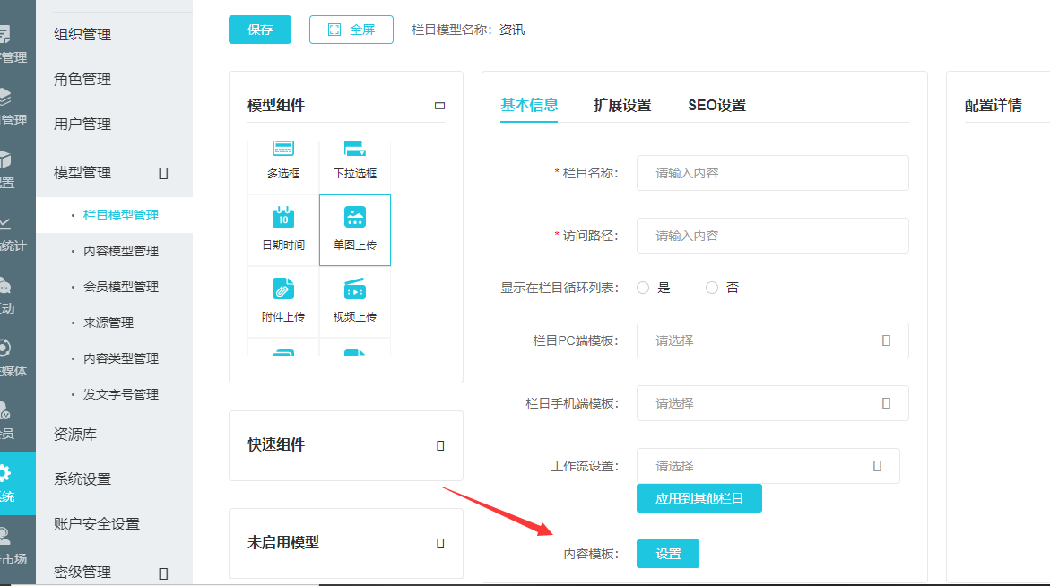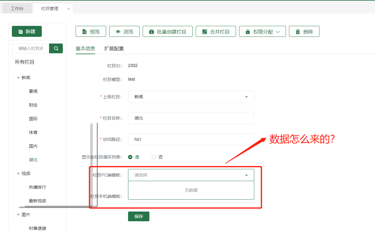 栏目PC端和手机端模板下拉数据从哪里来的呢?栏目类型和内容类型中都没有配置的入口