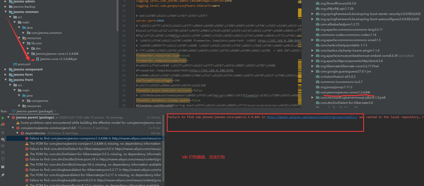 也去 Local repository目录下的\com\jeecms\jeecms-core 目录删除里面的文件 ->刷新maven ->clean->package 还是这个错误。 |
