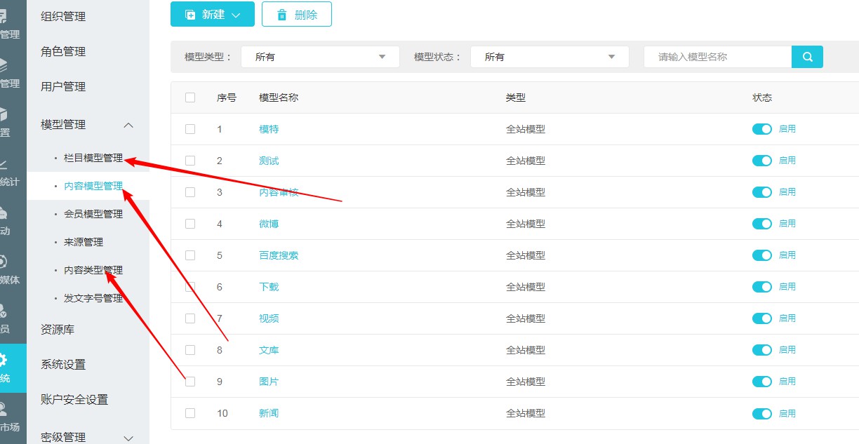 栏目模型是您创建栏目需要使用什么样的模型,内容模型就是您在该栏目下发布内容,展示的内容页面是怎样的,我们有自带的栏目模型,他下面需要引用内容模型才会显示,内容类型模型就是您发布文章后,可以设定属于什么类型的新闻 |