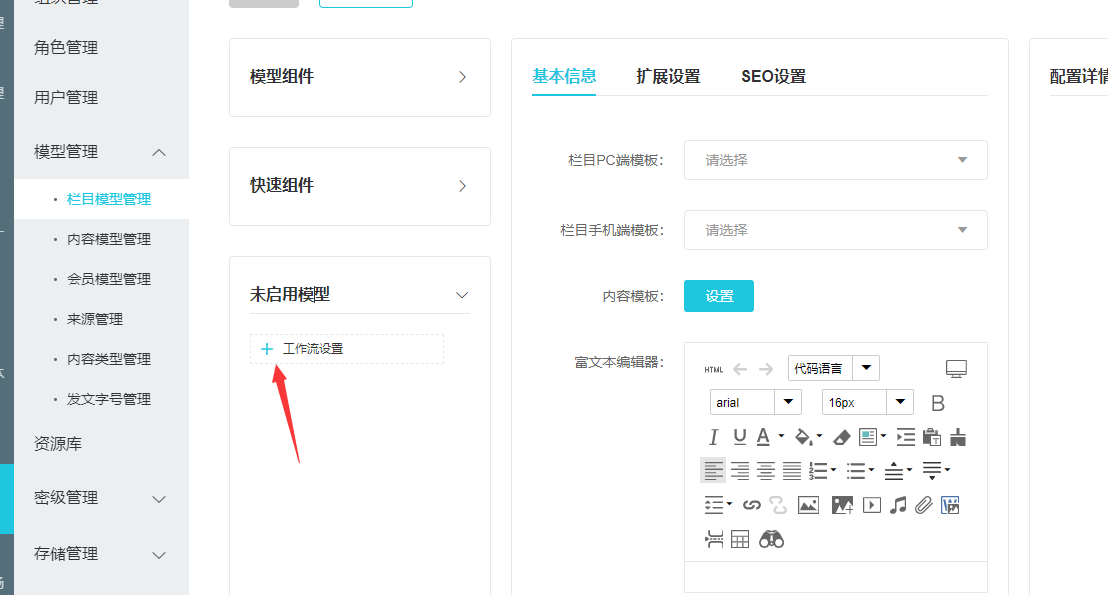 操作文档内说,需要在栏目配置选择工作流,但是栏目配置里面没有看到相关模块