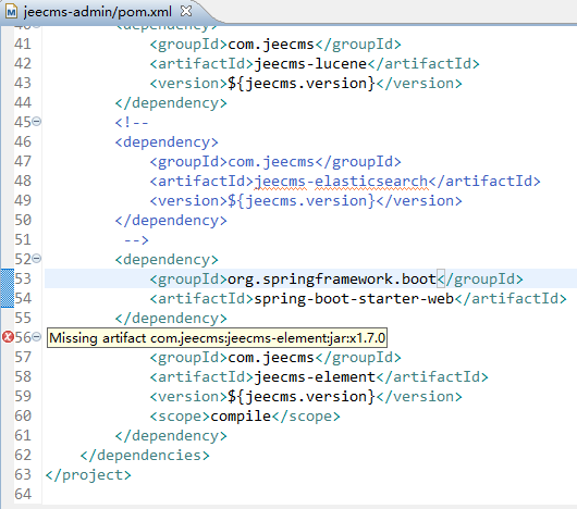 从Eclipse中导入mysql版的jeecms-parent源码,然后eclipse提示。 ![]() “Run As”-“Maven install” 报错: [ERROR] Failed to execute goal on project jeecms-admin: Could not resolve dependencies for project com.jeecms:jeecms-admin:jar:x1.7.0: Failure to find com.jeecms:jeecms-element:jar:x1.7.0 in https://repo.maven.apache.org/maven2 was cached in the local repository, resolution will not be reattempted until the update interval of central has elapsed or updates are forced -> [Help 1] |
