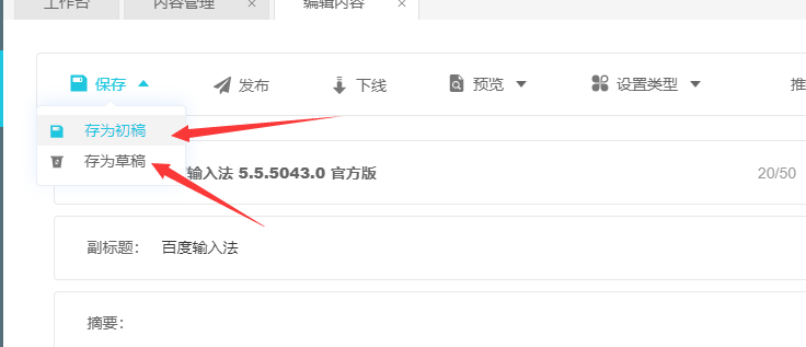如图,图中的“保存”按钮下只有一个子按钮“存为初稿”,现在是希望只有一个按钮“保存为初稿”,不用再去点击两次