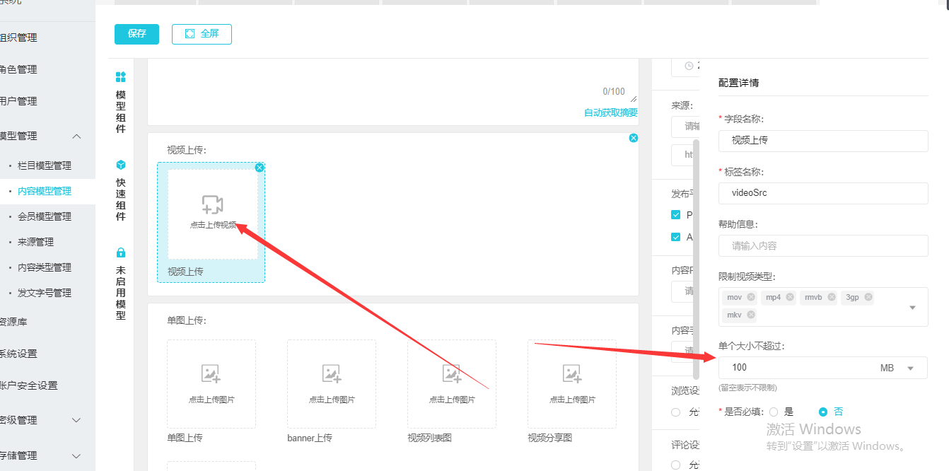 上传限制看您后台是否设置限制大小,或者模型组件是否设置了上传大小 |