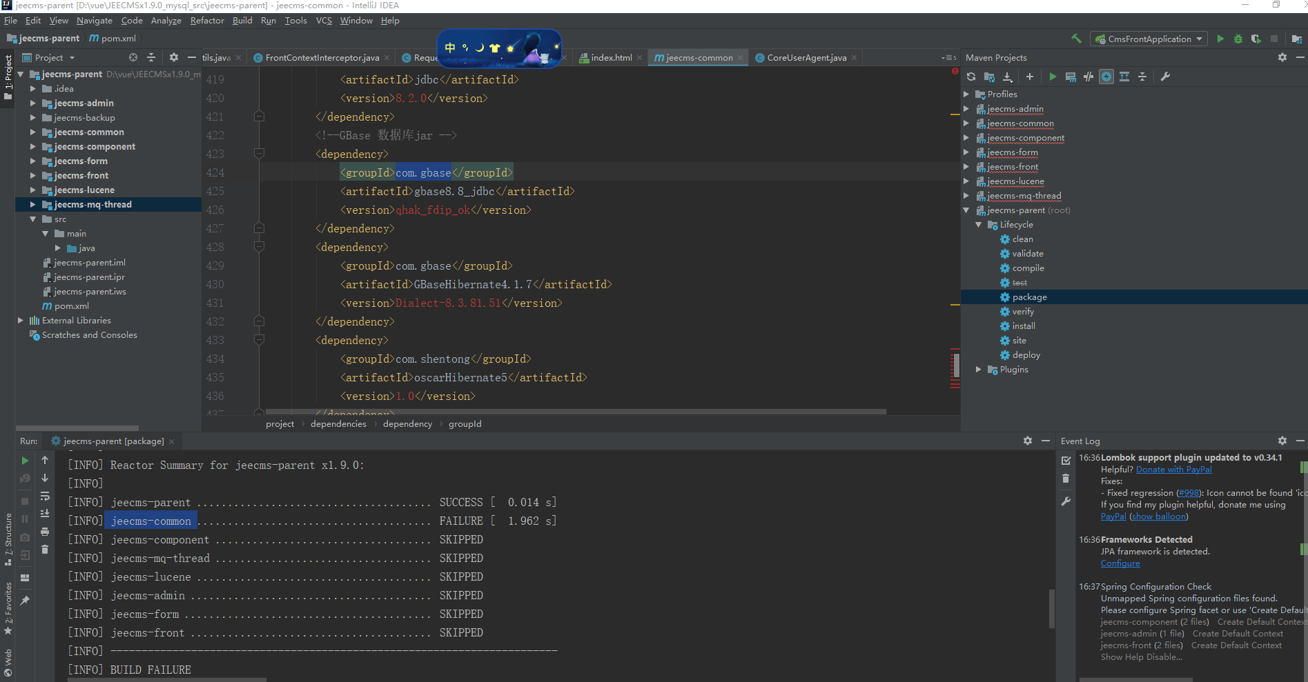 是的,skip test clena 后package,打包到 jeecms-common 就失败了