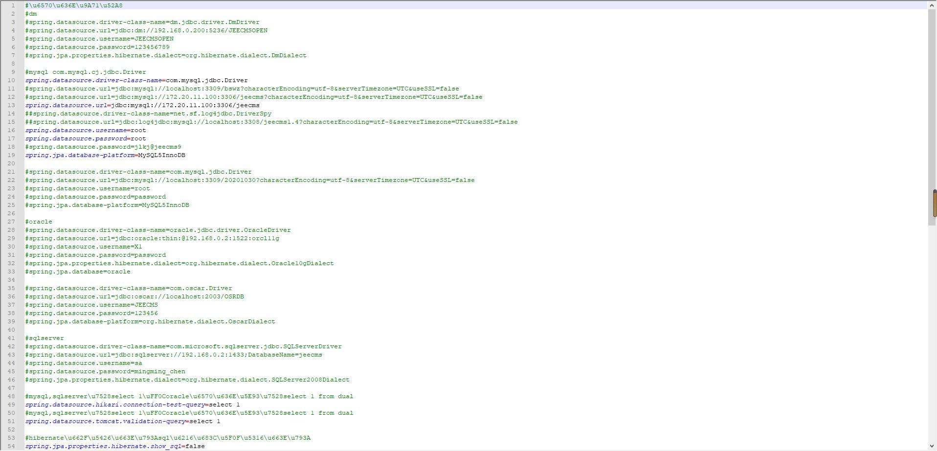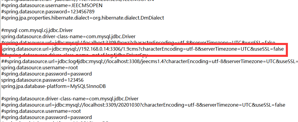 spring.datasource.url=jdbc:mysql://172.20.11.100:3306/jeecms?characterEncoding=utf-8&serverTimezone=UTC&useSSL=false