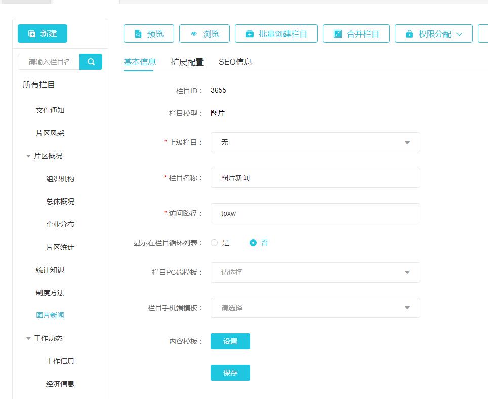 网站后台发现某个下设站点内的栏目缺少了模板设置功能,如图所示,图一为正常的栏目,图二为不正常的栏目,请问如何修复。