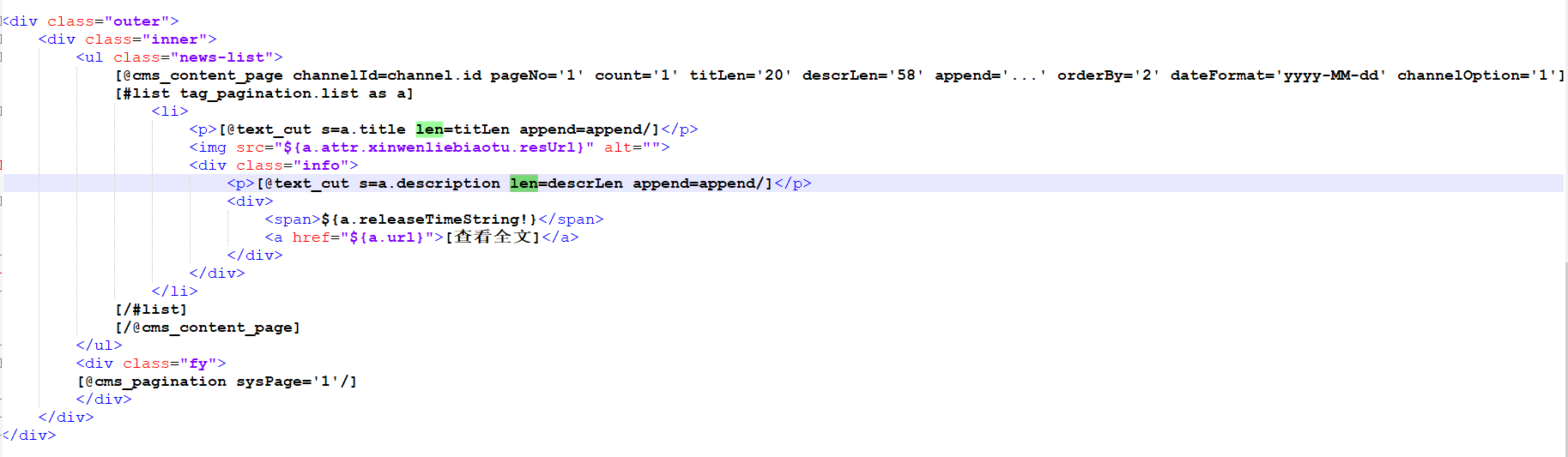 [@cms_content_page channelId=channel.id count='15'pageNo=1 titLen='60' append='...' orderBy='4' dateFormat='YYYY-MM-dd'] [#list tag_pagination.content as a] <li> <a href="${a.url}" title="[@text_cut s=a.title /]" >[@text_cut s=a.title len=titLen append=append/]</a> <span>${a.releaseTime?string(dateFormat)} </span> </li> [/#list] </ul> <div class="fy"> [@cms_pagination sysPage='1'/] </div> </div> [/@cms_content_page] </div> 是这个么? 但是我看这个写法,有的标签是没有闭合呢,ul div |