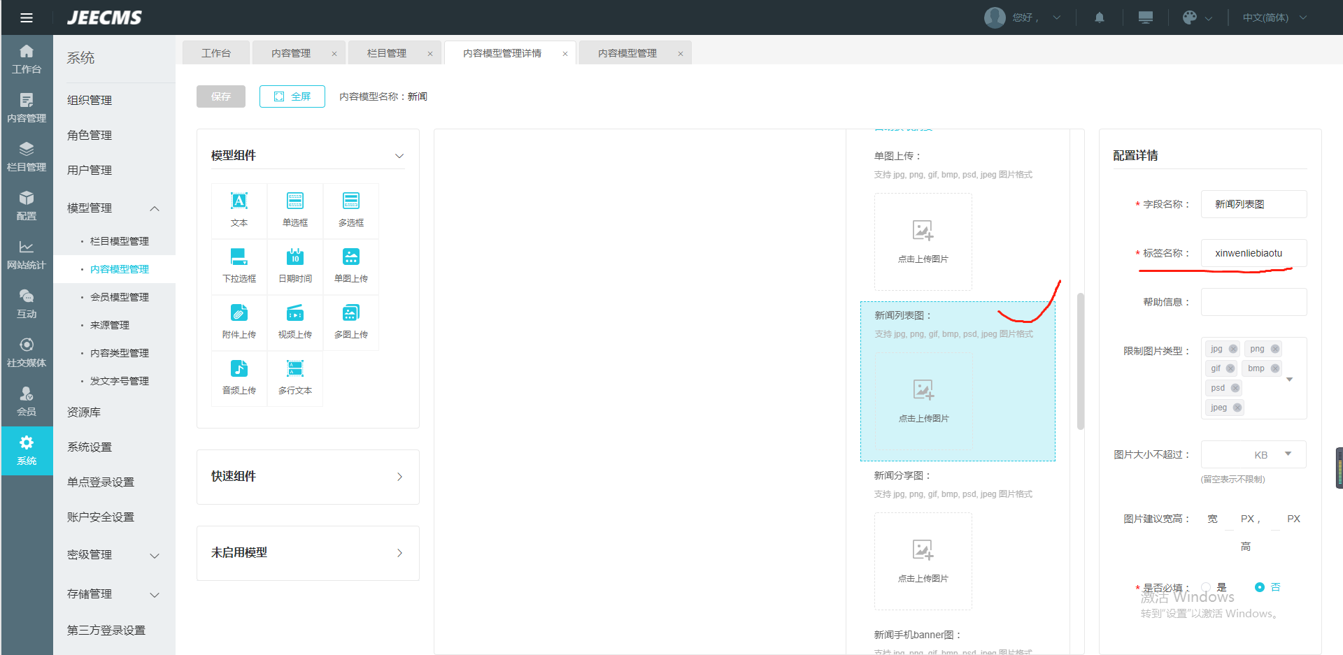 您好,您需要去模型管理的内容模型把组件拖过去,然后保存。前台要显示后台那个组件上传的图片是需要通过标签调用的呢。内容模型的话标签那块可以看看前台标签文档的内容详情那块