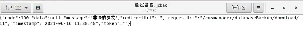 备份已经生成了备份文件但是打开却是这样的 {"code":100,"data":null,"message":"非法的参数","redirectUrl":"","requestUrl":"/cmsmanager/databaseBackup/download/11","timestamp":"2021-06-16 11:38:48","token":""} |
