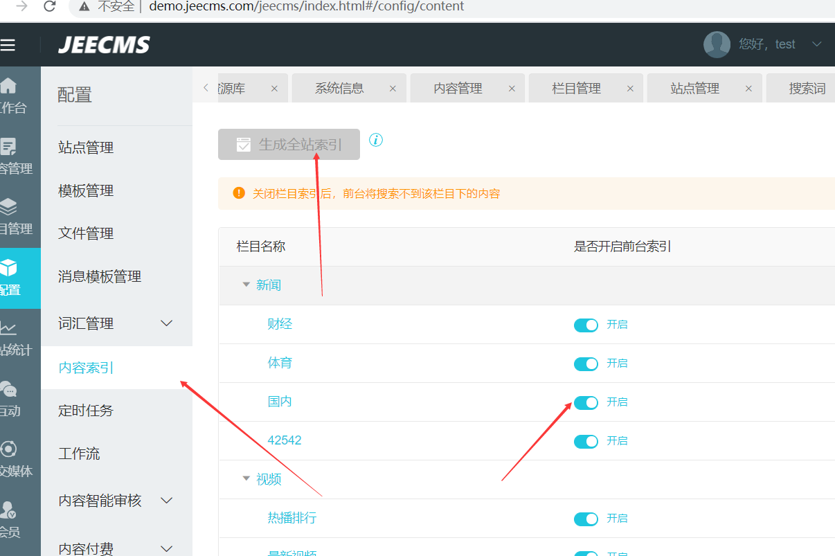 那新增的栏目和内容,也会能搜到了吗?还是得去内容索引点一次?