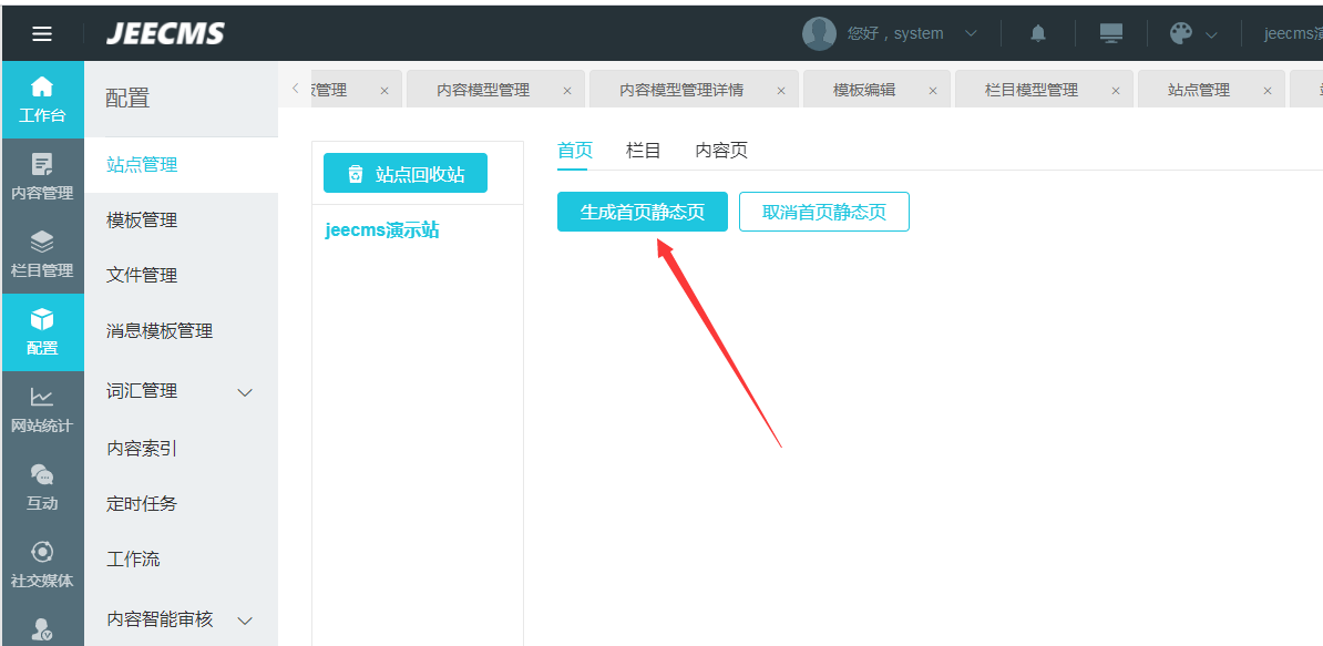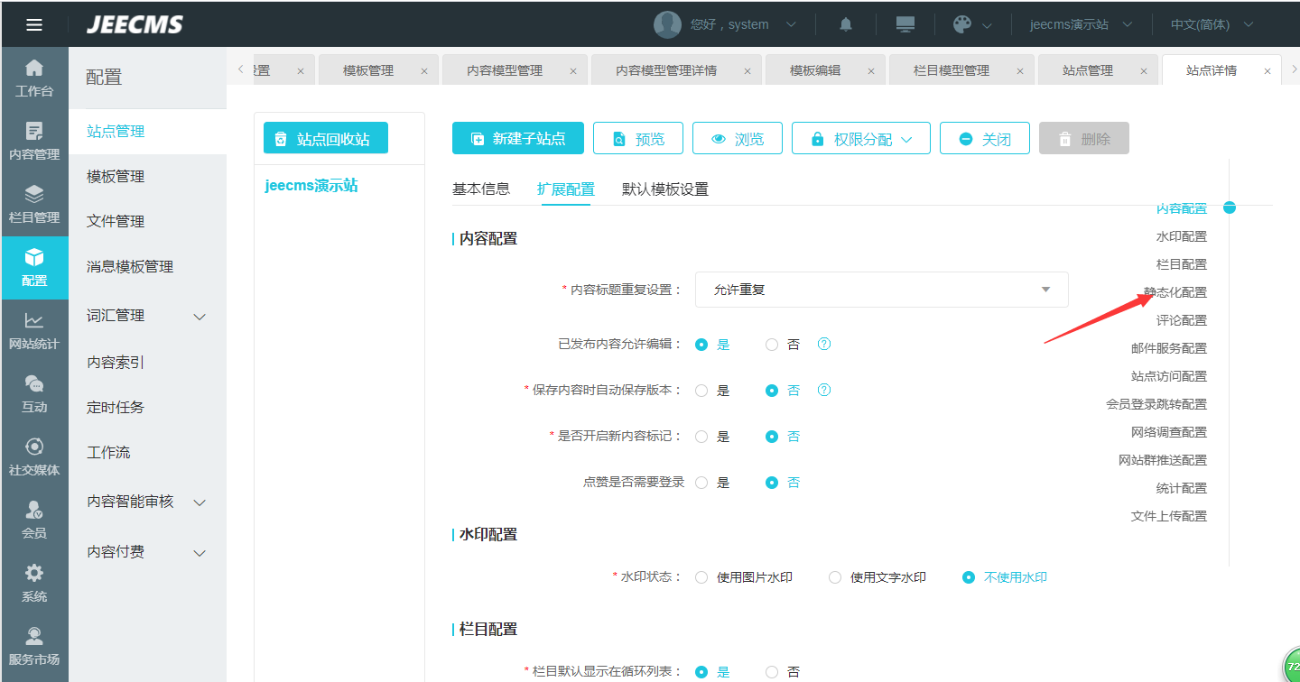 要开启静态化设置后保存,然后点击设置静态页 |
