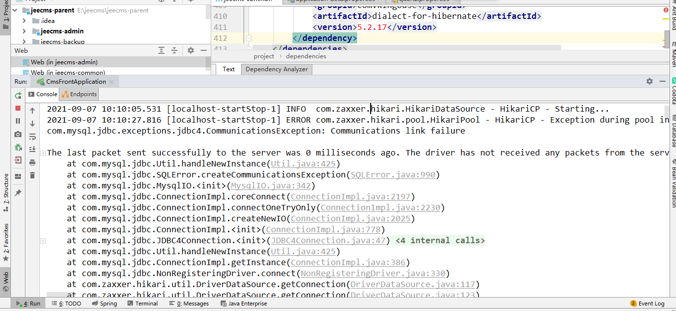 跟这块有关系吗? The last packet sent successfully to the server was 0 milliseconds ago. The driver has not received any packets from the server. 2021-09-07 11:05:37.415 [localhost-startStop-1] INFO org.hibernate.dialect.Dialect - HHH000400: Using dialect: org.hibernate.dialect.MySQL5InnoDBDialect 2021-09-07 11:05:37.490 [localhost-startStop-1] INFO o.h.engine.jdbc.env.internal.LobCreatorBuilderImpl - HHH000422: Disabling contextual LOB creation as connection was null 2021-09-07 11:05:38.780 [localhost-startStop-1] WARN org.hibernate.orm.deprecation - HHH90000021: Encountered deprecated setting [hibernate.ejb.interceptor], use [hibernate.session_factory.interceptor] instead 2021-09-07 11:05:42.024 [localhost-startStop-1] INFO org.hibernate.cache.spi.UpdateTimestampsCache - HHH000250: Starting update timestamps cache at region: org.hibernate.cache.spi.UpdateTimestampsCache 2021-09-07 11:05:42.027 [localhost-startStop-1] INFO org.hibernate.cache.internal.StandardQueryCache - HHH000248: Starting query cache at region: org.hibernate.cache.internal.StandardQueryCache 2021-09-07 11:05:44.982 [localhost-startStop-1] WARN c.j.common.web.cache.SingletonEhCacheRegionFactory - HHH020003: Could not find a specific ehcache configuration for cache named [com.jeecms.content.domain.Content.contentTypes]; using defaults. 2021-09-07 11:05:44.983 [localhost-startStop-1] WARN net.sf.ehcache.config.CacheConfiguration - Configuration problem for cache com.jeecms.content.domain.Content.contentTypes: MaxEntriesLocalHeap equal or greater than MaxEntriesLocalDisk. This will result in useless disk storage. 2021-09-07 11:05:45.912 [localhost-startStop-1] INFO o.h.hql.internal.QueryTranslatorFactoryInitiator - HHH000397: Using ASTQueryTranslatorFactory 2021-09-07 11:05:46.209 [localhost-startStop-1] INFO o.s.orm.jpa.LocalContainerEntityManagerFactoryBean - Initialized JPA EntityManagerFactory for persistence unit 'default' 2021-09-07 11:05:46.236 [localhost-startStop-1] INFO com.zaxxer.hikari.HikariDataSource - HikariCP - Starting... 2021-09-07 11:06:08.241 [localhost-startStop-1] ERROR com.zaxxer.hikari.pool.HikariPool - HikariCP - Exception during pool initialization. com.mysql.jdbc.exceptions.jdbc4.CommunicationsException: Communications link failure |