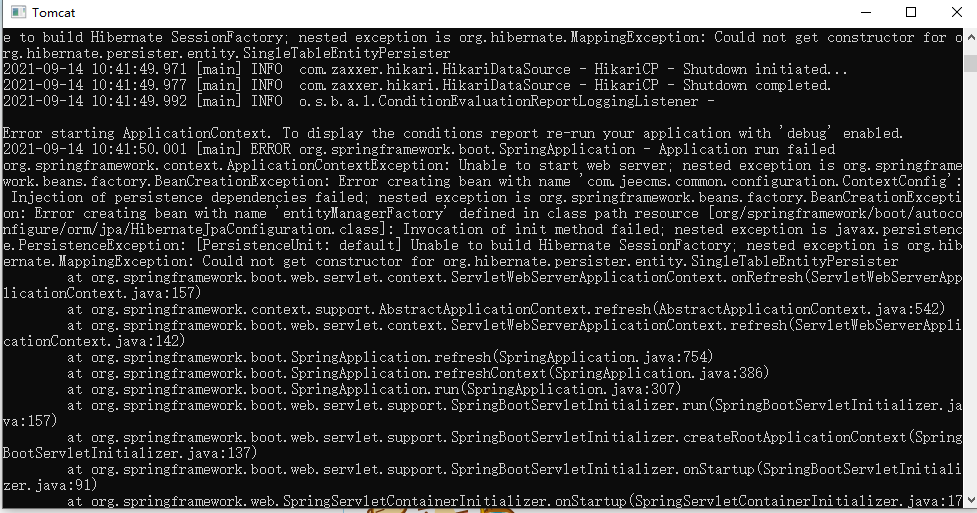 14-Sep-2021 15:09:24.634 严重 [main] org.apache.catalina.startup.HostConfig.deployDirectory 无法部署应用目录 [D:\apache-tomcat-9.0.46\webapps\ROOT] java.lang.IllegalStateException: 启动子级时出错 at org.apache.catalina.core.ContainerBase.addChildInternal(ContainerBase.java:720) at org.apache.catalina.core.ContainerBase.addChild(ContainerBase.java:690) at org.apache.catalina.core.StandardHost.addChild(StandardHost.java:692) at org.apache.catalina.startup.HostConfig.deployDirectory(HostConfig.java:1184) at org.apache.catalina.startup.HostConfig$DeployDirectory.run(HostConfig.java:1925) at java.base/java.util.concurrent.Executors$RunnableAdapter.call(Executors.java:515) at java.base/java.util.concurrent.FutureTask.run(FutureTask.java:264) at org.apache.tomcat.util.threads.InlineExecutorService.execute(InlineExecutorService.java:75) at java.base/java.util.concurrent.AbstractExecutorService.submit(AbstractExecutorService.java:123) at org.apache.catalina.startup.HostConfig.deployDirectories(HostConfig.java:1094) at org.apache.catalina.startup.HostConfig.deployApps(HostConfig.java:476) at org.apache.catalina.startup.HostConfig.start(HostConfig.java:1611) at org.apache.catalina.startup.HostConfig.lifecycleEvent(HostConfig.java:319) at org.apache.catalina.util.LifecycleBase.fireLifecycleEvent(LifecycleBase.java:123) at org.apache.catalina.util.LifecycleBase.setStateInternal(LifecycleBase.java:423) at org.apache.catalina.util.LifecycleBase.setState(LifecycleBase.java:366) at org.apache.catalina.core.ContainerBase.startInternal(ContainerBase.java:936) at org.apache.catalina.core.StandardHost.startInternal(StandardHost.java:829) at org.apache.catalina.util.LifecycleBase.start(LifecycleBase.java:183) at org.apache.catalina.core.ContainerBase$StartChild.call(ContainerBase.java:1384) at org.apache.catalina.core.ContainerBase$StartChild.call(ContainerBase.java:1374) at java.base/java.util.concurrent.FutureTask.run(FutureTask.java:264) at org.apache.tomcat.util.threads.InlineExecutorService.execute(InlineExecutorService.java:75) at java.base/java.util.concurrent.AbstractExecutorService.submit(AbstractExecutorService.java:145) at org.apache.catalina.core.ContainerBase.startInternal(ContainerBase.java:909) at org.apache.catalina.core.StandardEngine.startInternal(StandardEngine.java:262) at org.apache.catalina.util.LifecycleBase.start(LifecycleBase.java:183) at org.apache.catalina.core.StandardService.startInternal(StandardService.java:433) at org.apache.catalina.util.LifecycleBase.start(LifecycleBase.java:183) at org.apache.catalina.core.StandardServer.startInternal(StandardServer.java:930) at org.apache.catalina.util.LifecycleBase.start(LifecycleBase.java:183) at org.apache.catalina.startup.Catalina.start(Catalina.java:772) at java.base/jdk.internal.reflect.NativeMethodAccessorImpl.invoke0(Native Method) at java.base/jdk.internal.reflect.NativeMethodAccessorImpl.invoke(NativeMethodAccessorImpl.java:78) at java.base/jdk.internal.reflect.DelegatingMethodAccessorImpl.invoke(DelegatingMethodAccessorImpl.java:43) at java.base/java.lang.reflect.Method.invoke(Method.java:567) at org.apache.catalina.startup.Bootstrap.start(Bootstrap.java:342) at org.apache.catalina.startup.Bootstrap.main(Bootstrap.java:473) Caused by: org.apache.catalina.LifecycleException: 无法启动组件[StandardEngine[Catalina].StandardHost[localhost].StandardContext[]] at org.apache.catalina.util.LifecycleBase.handleSubClassException(LifecycleBase.java:440) at org.apache.catalina.util.LifecycleBase.start(LifecycleBase.java:198) at org.apache.catalina.core.ContainerBase.addChildInternal(ContainerBase.java:717) ... 37 more Caused by: org.springframework.context.ApplicationContextException: Unable to start web server; nested exception is org.springframework.beans.factory.BeanCreationException: Error creating bean with name 'com.jeecms.common.configuration.ContextConfig': Injection of persistence dependencies failed; nested exception is org.springframework.beans.factory.BeanCreationException: Error creating bean with name 'entityManagerFactory' defined in class path resource [org/springframework/boot/autoconfigure/orm/jpa/HibernateJpaConfiguration.class]: Invocation of init method failed; nested exception is javax.persistence.PersistenceException: [PersistenceUnit: default] Unable to build Hibernate SessionFactory; nested exception is org.hibernate.MappingException: Could not get constructor for org.hibernate.persister.entity.SingleTableEntityPersister at org.springframework.boot.web.servlet.context.ServletWebServerApplicationContext.onRefresh(ServletWebServerApplicationContext.java:157) at org.springframework.context.support.AbstractApplicationContext.refresh(AbstractApplicationContext.java:542) at org.springframework.boot.web.servlet.context.ServletWebServerApplicationContext.refresh(ServletWebServerApplicationContext.java:142) at org.springframework.boot.SpringApplication.refresh(SpringApplication.java:754) at org.springframework.boot.SpringApplication.refreshContext(SpringApplication.java:386) at org.springframework.boot.SpringApplication.run(SpringApplication.java:307) at org.springframework.boot.web.servlet.support.SpringBootServletInitializer.run(SpringBootServletInitializer.java:157) at org.springframework.boot.web.servlet.support.SpringBootServletInitializer.createRootApplicationContext(SpringBootServletInitializer.java:137) at org.springframework.boot.web.servlet.support.SpringBootServletInitializer.onStartup(SpringBootServletInitializer.java:91) at org.springframework.web.SpringServletContainerInitializer.onStartup(SpringServletContainerInitializer.java:172) at org.apache.catalina.core.StandardContext.startInternal(StandardContext.java:5161) at org.apache.catalina.util.LifecycleBase.start(LifecycleBase.java:183) ... 38 more Caused by: org.springframework.beans.factory.BeanCreationException: Error creating bean with name 'com.jeecms.common.configuration.ContextConfig': Injection of persistence dependencies failed; ne