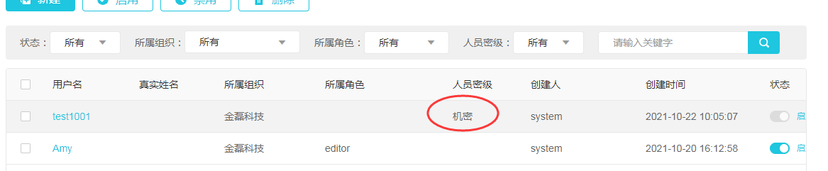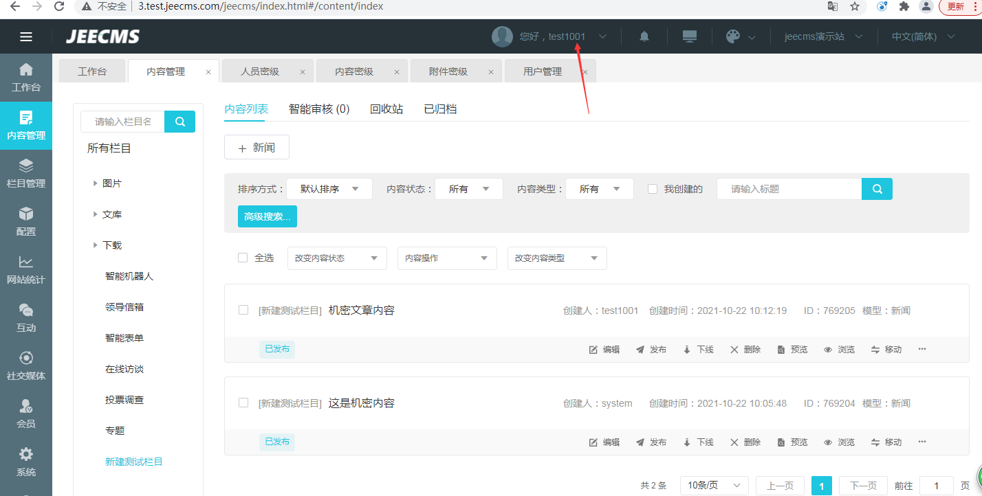 在后台内容列表查看,比如发布对应密级的文章 需要有对应人员密级的管理员才能查看 |