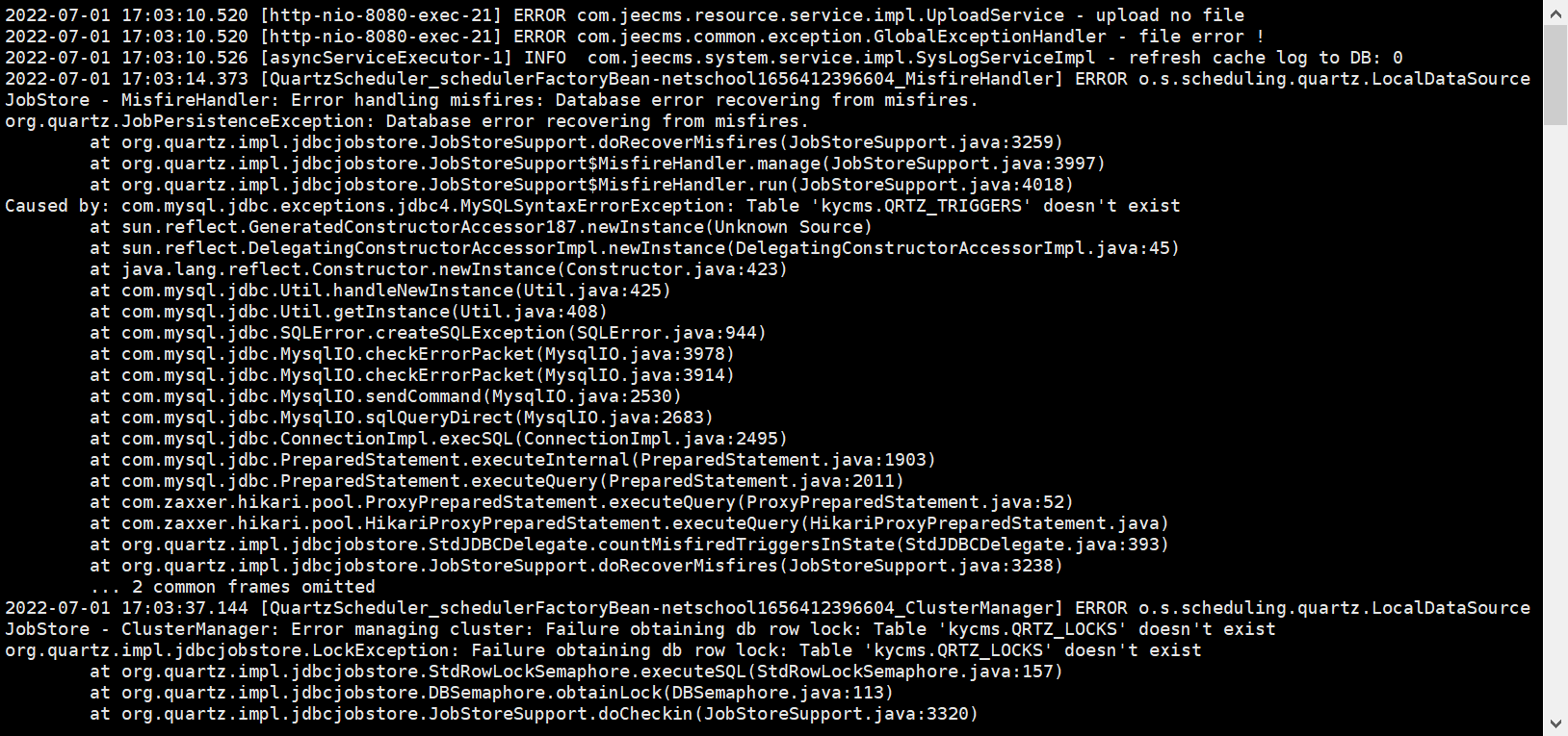 看下数据库是否有qrtz 开头的表 有的话忽略下数据库大小写