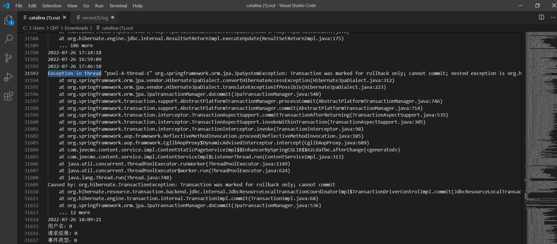 at org.springframework.orm.jpa.vendor.HibernateJpaDialect.convertHibernateAccessException(HibernateJpaDialect.java:312) at org.springframework.orm.jpa.vendor.HibernateJpaDialect.translateExceptionIfPossible(HibernateJpaDialect.java:223) at org.springframework.orm.jpa.JpaTransactionManager.doCommit(JpaTransactionManager.java:540) at org.springframework.transaction.support.AbstractPlatformTransactionManager.processCommit(AbstractPlatformTransactionManager.java:746) at org.springframework.transaction.support.AbstractPlatformTransactionManager.commit(AbstractPlatformTransactionManager.java:714) at org.springframework.transaction.interceptor.TransactionAspectSupport.commitTransactionAfterReturning(TransactionAspectSupport.java:535) at org.springframework.transaction.interceptor.TransactionAspectSupport.invokeWithinTransaction(TransactionAspectSupport.java:305) at org.springframework.transaction.interceptor.TransactionInterceptor.invoke(TransactionInterceptor.java:98) at org.springframework.aop.framework.ReflectiveMethodInvocation.proceed(ReflectiveMethodInvocation.java:185) at org.springframework.aop.framework.CglibAopProxy$DynamicAdvisedInterceptor.intercept(CglibAopProxy.java:689) at com.jeecms.content.service.impl.ContentStaticPageServiceImpl$$EnhancerBySpringCGLIB$$62cdafbe.afterChange(<generated>) at com.jeecms.content.service.impl.ContentServiceImpl$ListenerThread.run(ContentServiceImpl.java:313) at java.util.concurrent.ThreadPoolExecutor.runWorker(ThreadPoolExecutor.java:1149) at java.util.concurrent.ThreadPoolExecutor$Worker.run(ThreadPoolExecutor.java:624) at java.lang.Thread.run(Thread.java:748) Caused by: org.hibernate.TransactionException: Transaction was marked for rollback only; cannot commit at org.hibernate.resource.transaction.backend.jdbc.internal.JdbcResourceLocalTransactionCoordinatorImpl$TransactionDriverControlImpl.commit(JdbcResourceLocalTransactionCoordinatorImpl.java:228) at org.hibernate.engine.transaction.internal.TransactionImpl.commit(TransactionImpl.java:68) at org.springframework.orm.jpa.JpaTransactionManager.doCommit(JpaTransactionManager.java:536) ... 12 more |