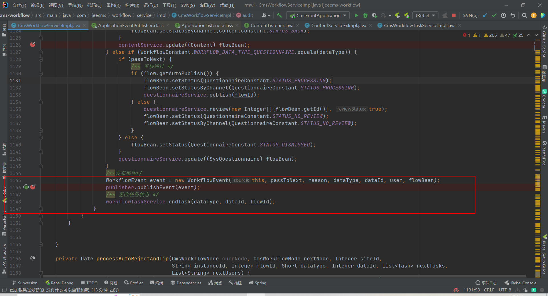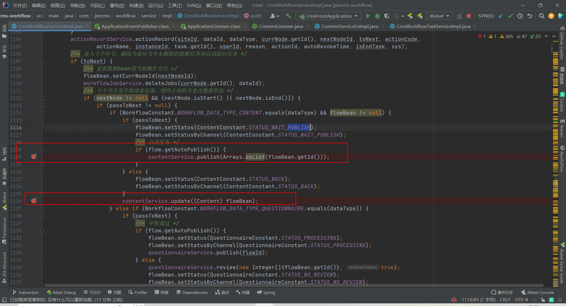 1、先设置工作流,勾选审核完成后自动发布功能。 2、审核人点击审核通过的方法打debug,慢慢走,就会出现这种情况。 CmsWorkflowServiceImpl实现类里面打断点,逐步走,大概1分钟后放开断点就会出现。 |
