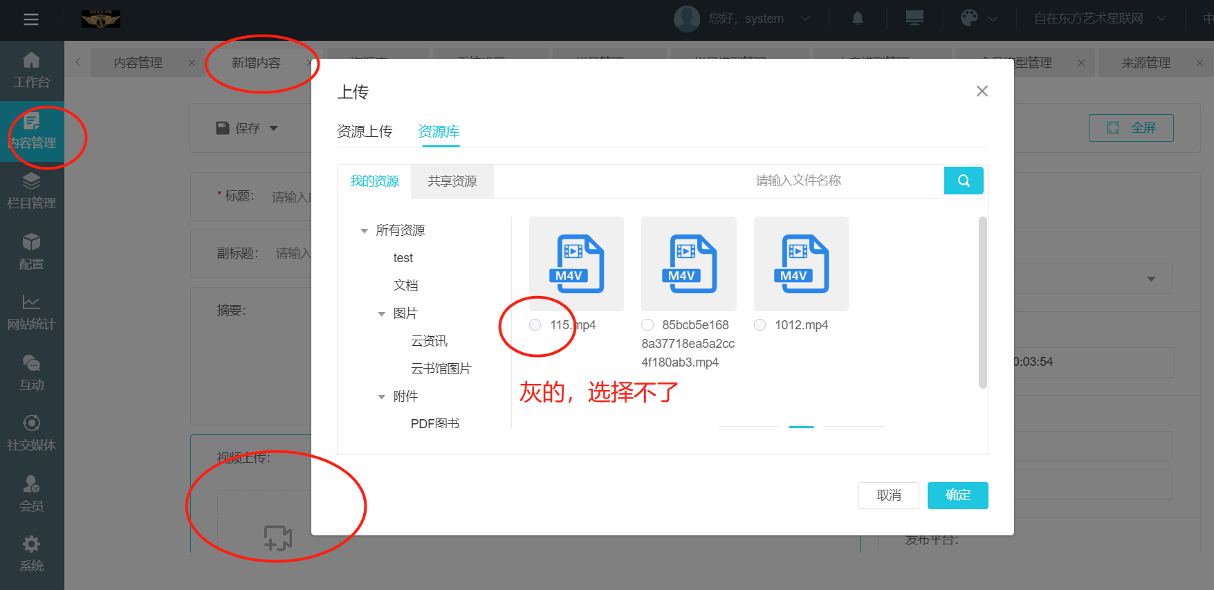 在发布内容过程,无法选择资源库中的资源,共享资源也无法选择