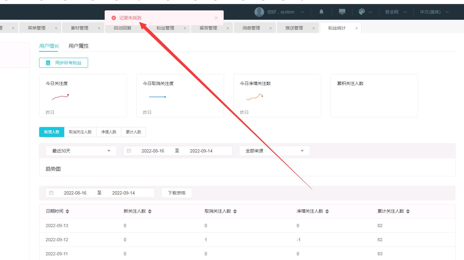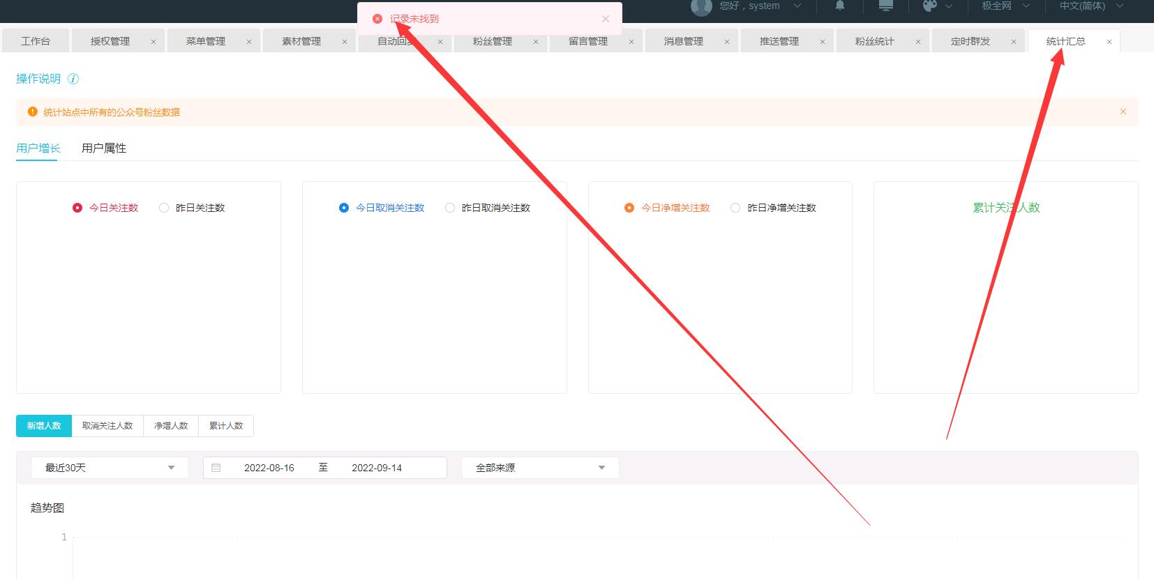 授权后点击同步出现记录为找到:粉丝统计记录未找到::统计汇总:记录未找到:公众号重新授权显示,错误702