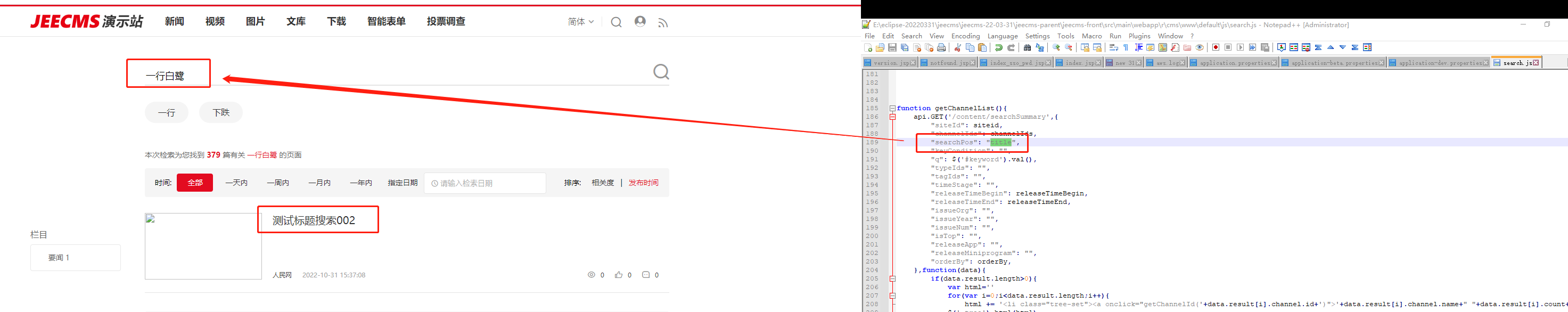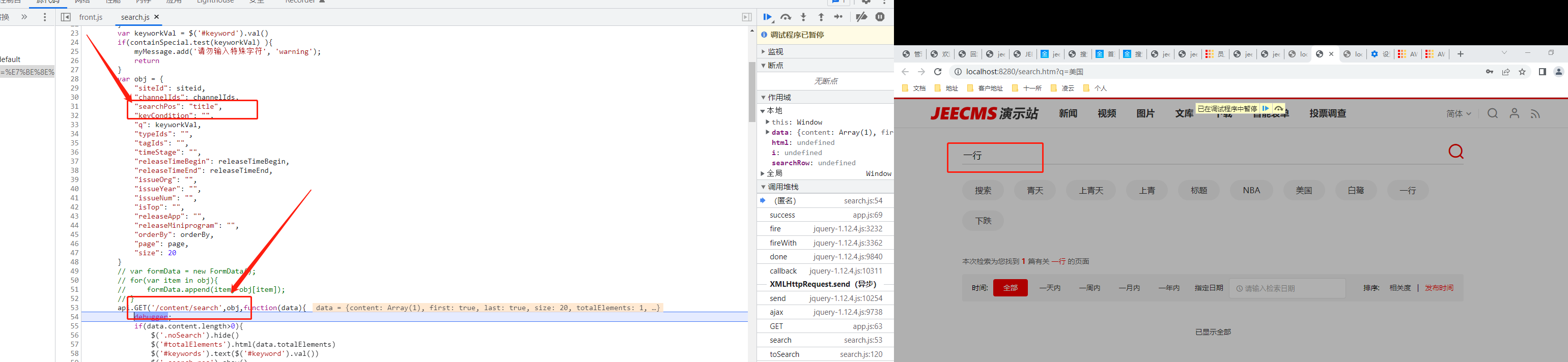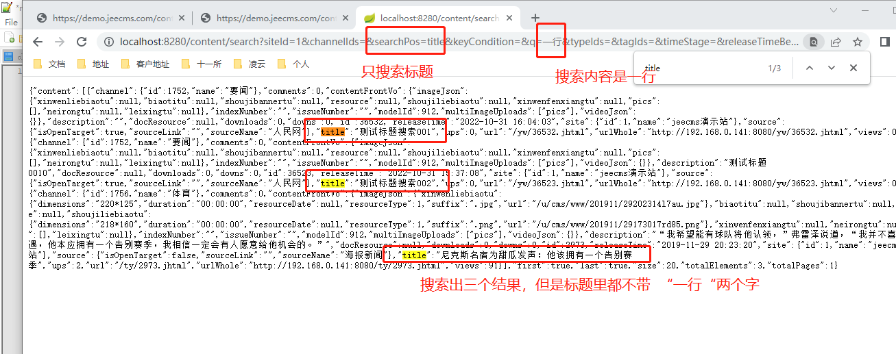 https://demo.jeecms.com/content/search?siteId=1&channelIds=&keyCondition=&q=%E4%B9%A0%E8%BF%91%E5%B9%B3&typeIds=&tagIds=&timeStage=&releaseTimeBegin=&releaseTimeEnd=&issueOrg=&issueYear=&issueNum=&isTop=&releaseApp=&releaseMiniprogram=&orderBy=27&page=1&size=20 您可以测试下直接接口访问看看是不是结果不同的 |