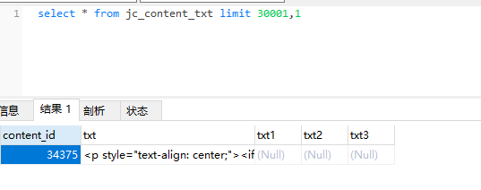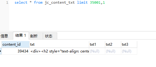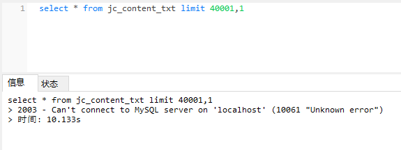 select * from jc_content_txt limit 35001,1 和 select * from jc_content_txt limit 30001,1 都可以查询 而 select * from jc_content_txt limit 40001,1 不可以 直接导致mysql服务崩溃 |