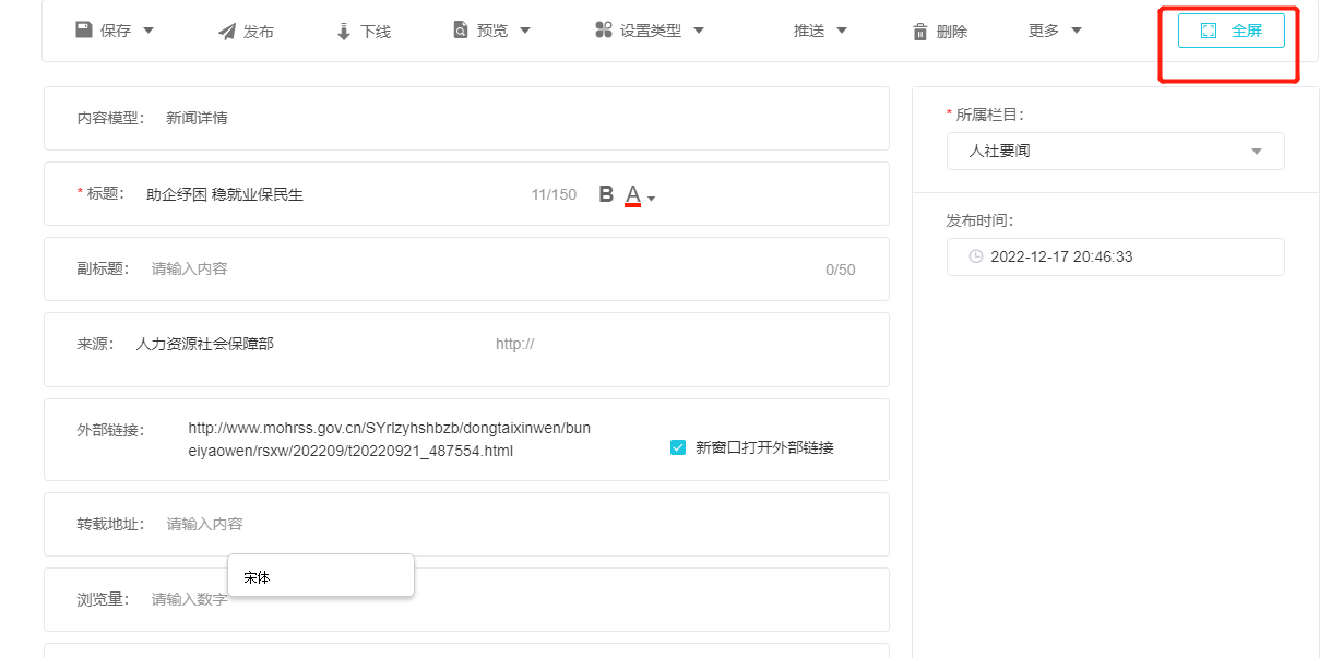 内容管理里面编辑页,点击全屏后,富文本框里下拉域没有显示在当前全屏页