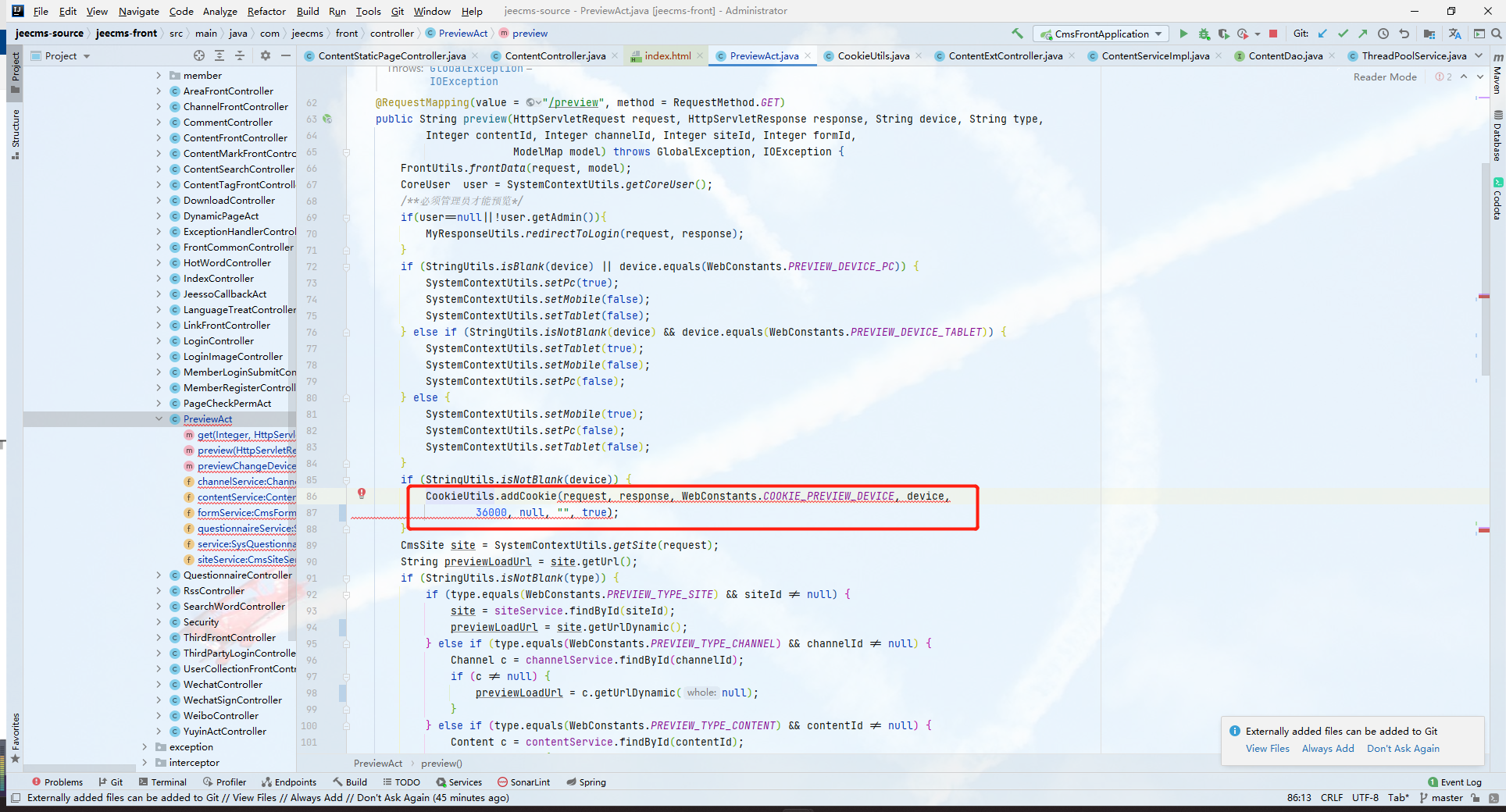 回复第2楼少文件,没有这个方法报错:jeecms-source/jeecms-common/src/main/java/com/jeecms/common/web/util/CookieUtils.java