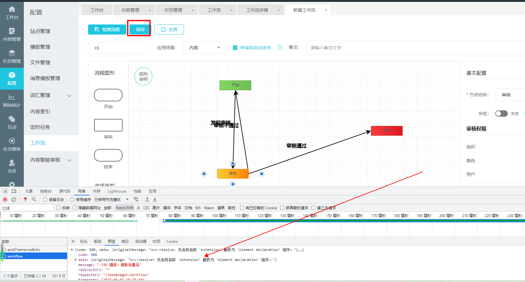 创建的工作流,检查流程是通过的,但是保存就会报错src-resolve: 无法将名称 'extension' 解析为 'element declaration' 组件,是我哪里操作的不对吗