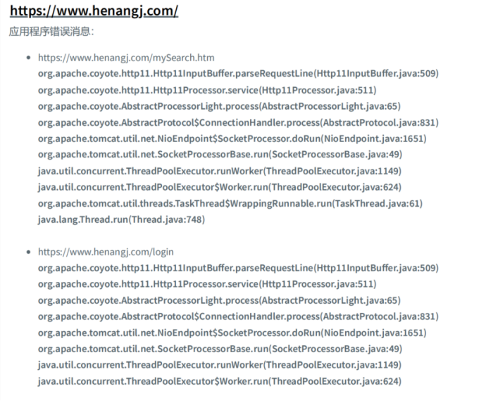 注意:HTTP请求解析错误的进一步发生将记录在DEBUG级别。 java.lang.IllegalArgumentException: 在方法名称中发现无效的字符串, HTTP 方法名必须是有效的符号. at org.apache.coyote.http11.Http11InputBuffer.parseRequestLine(Http11InputBuffer.java:434) at org.apache.coyote.http11.Http11Processor.service(Http11Processor.java:511) at org.apache.coyote.AbstractProcessorLight.process(AbstractProcessorLight.java:65) at org.apache.coyote.AbstractProtocol$ConnectionHandler.process(AbstractProtocol.java:831) at org.apache.tomcat.util.net.NioEndpoint$SocketProcessor.doRun(NioEndpoint.java:1651) at org.apache.tomcat.util.net.SocketProcessorBase.run(SocketProcessorBase.java:49) at java.util.concurrent.ThreadPoolExecutor.runWorker(ThreadPoolExecutor.java:1149) at java.util.concurrent.ThreadPoolExecutor$Worker.run(ThreadPoolExecutor.java:624) at org.apache.tomcat.util.threads.TaskThread$WrappingRunnable.run(TaskThread.java:61) at java.lang.Thread.run(Thread.java:748) 应该是这个问题,我看每天的日志都有 |