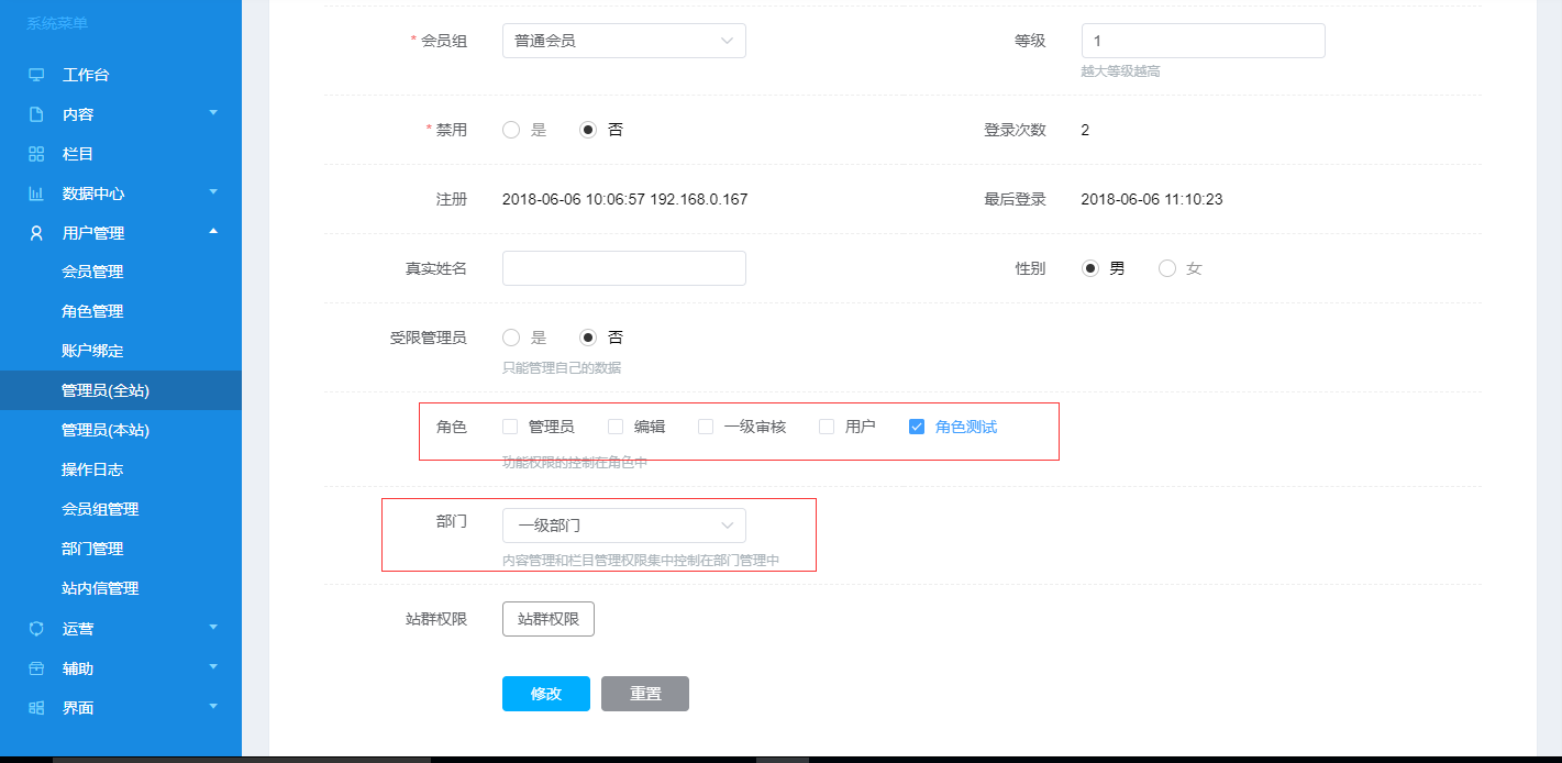 之前是在创建用户列表中选择的控制栏目权限,这个授权版在部门中,如果实现的话是不是很麻烦