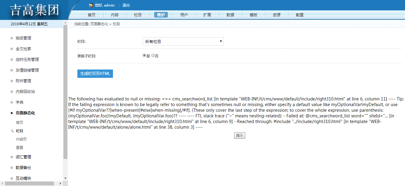 The following has evaluated to null or missing: ==> cms_searchword_list [in template "WEB-INF/t/cms/www/default/include/right310.html" at line 6, column 11] ---- Tip: If the failing expression is known to be legally refer to something that's sometimes null or missing, either specify a default value like myOptionalVar!myDefault, or use [#if myOptionalVar??]when-present[#else]when-missing[/#if]. (These only cover the last step of the expression; to cover the whole expression, use parenthesis: (myOptionalVar.foo)!myDefault, (myOptionalVar.foo)?? ---- ---- FTL stack trace ("~" means nesting-related): - Failed at: @cms_searchword_list word="" siteId="... [in template "WEB-INF/t/cms/www/default/include/right310.html" at line 6, column 9] - Reached through: #include "../include/right310.html" [in template "WEB-INF/t/cms/www/default/alone/alone.html" at line 38, column 3] ---- |