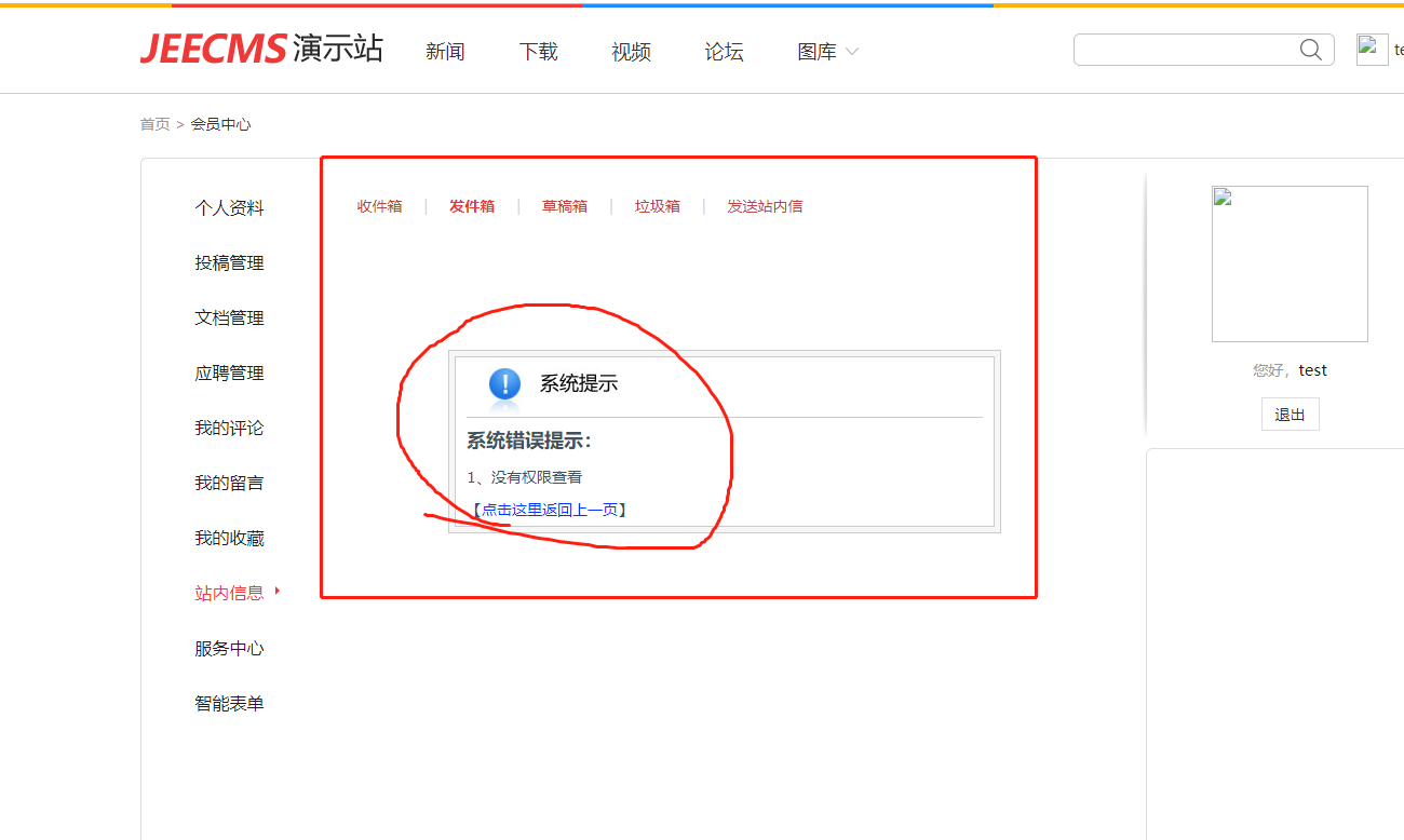 主题 : 站内信-选择发件箱中任意一条点击查看提示没有权限