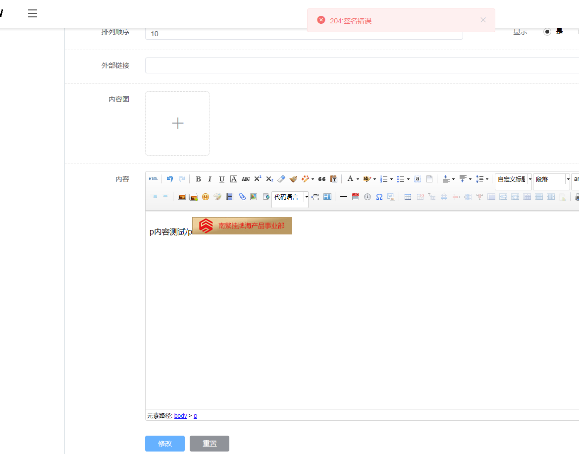 后台输入文字,前台乱码。输入图片,提示签名错误。如图
