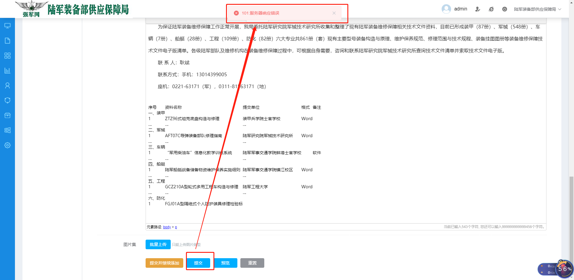 您好 我在添加内容点击提交的时候一直显示服务器响应错误怎么解决?