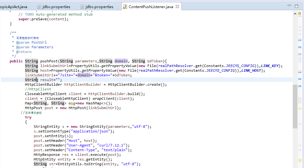 麻烦你翻楼看看我发的百度官方说明 你们这个文件(com/jeecms/cms/service/ContentPushListener.java)使用的是百度主动post推送, 但不知道为啥提交发布内容的收缺没有跟中到请求~~ ![]() 另外这个linkSubmitUrl+="?site="+domain+"&token="+bdToken; 这段代码中domain函数不对吧~ 应该加上protocol协议这个函数吧? 因为百度推送的时候要求携带http或者https协议,而咱们的系统域名和协议是分开的~ 麻烦你让负责写这块的人自己检查。。。 |