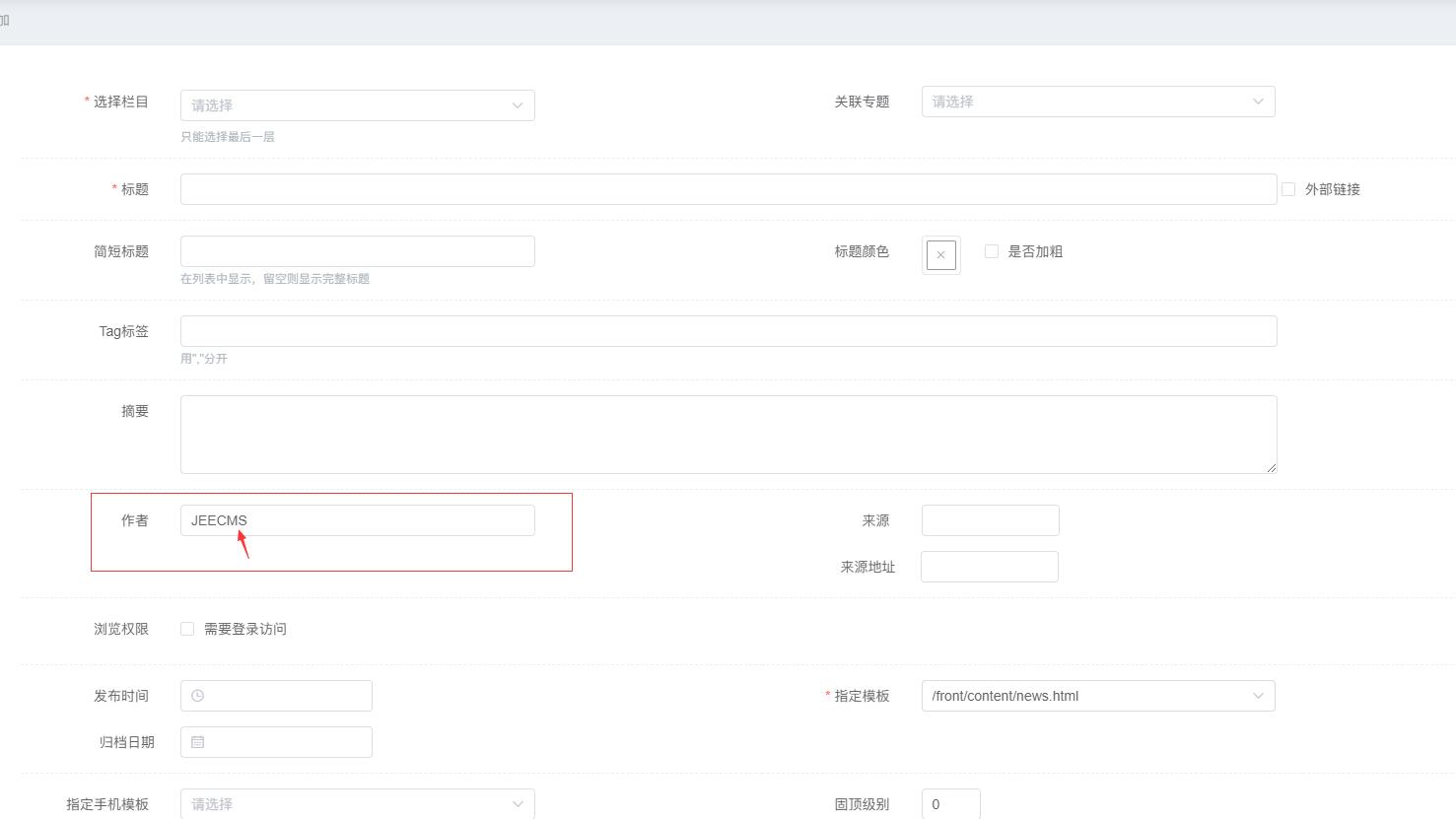 ${content.author!'JEECMS'} 内容详情页字段这么调用