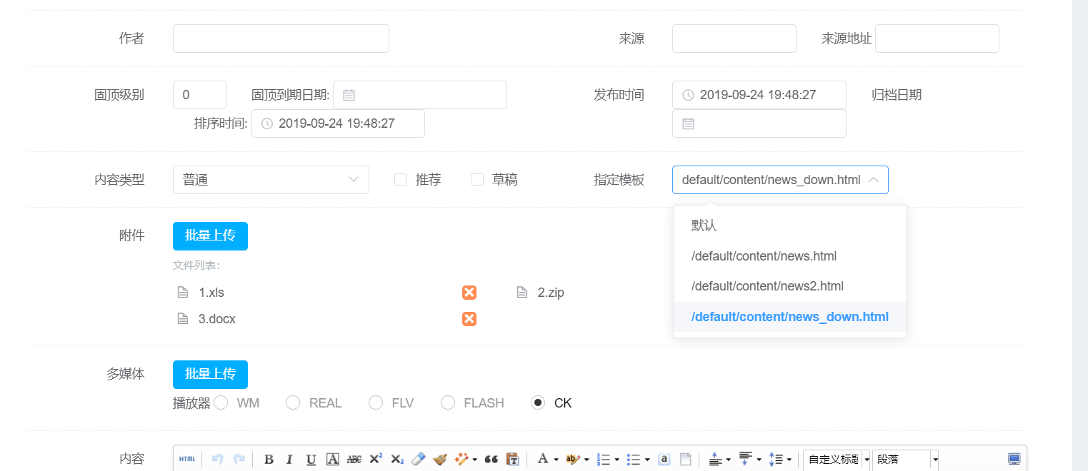 [#if content.attachments?size gt 0] [#list content.attachments as attach] <li> <a href="${attach.path}">点击下载:${attach.name!}</a><br><br><br> </li> [/#list] [/#if] </ul> |