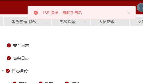 新版X1角色管理菜单类授权点击保存,弹出“-165 错误,请联系售后”错误多画框,如图