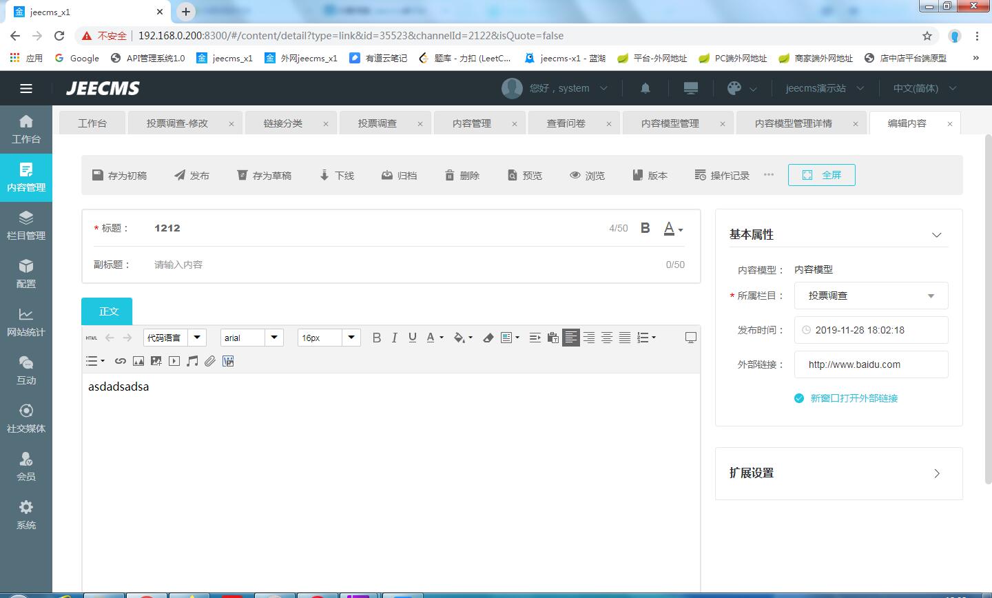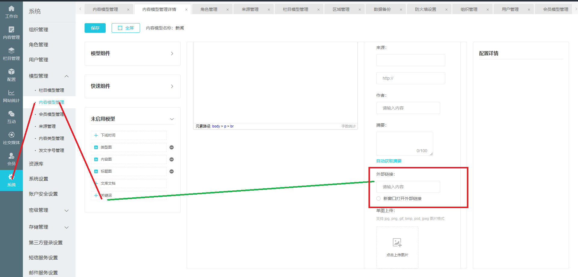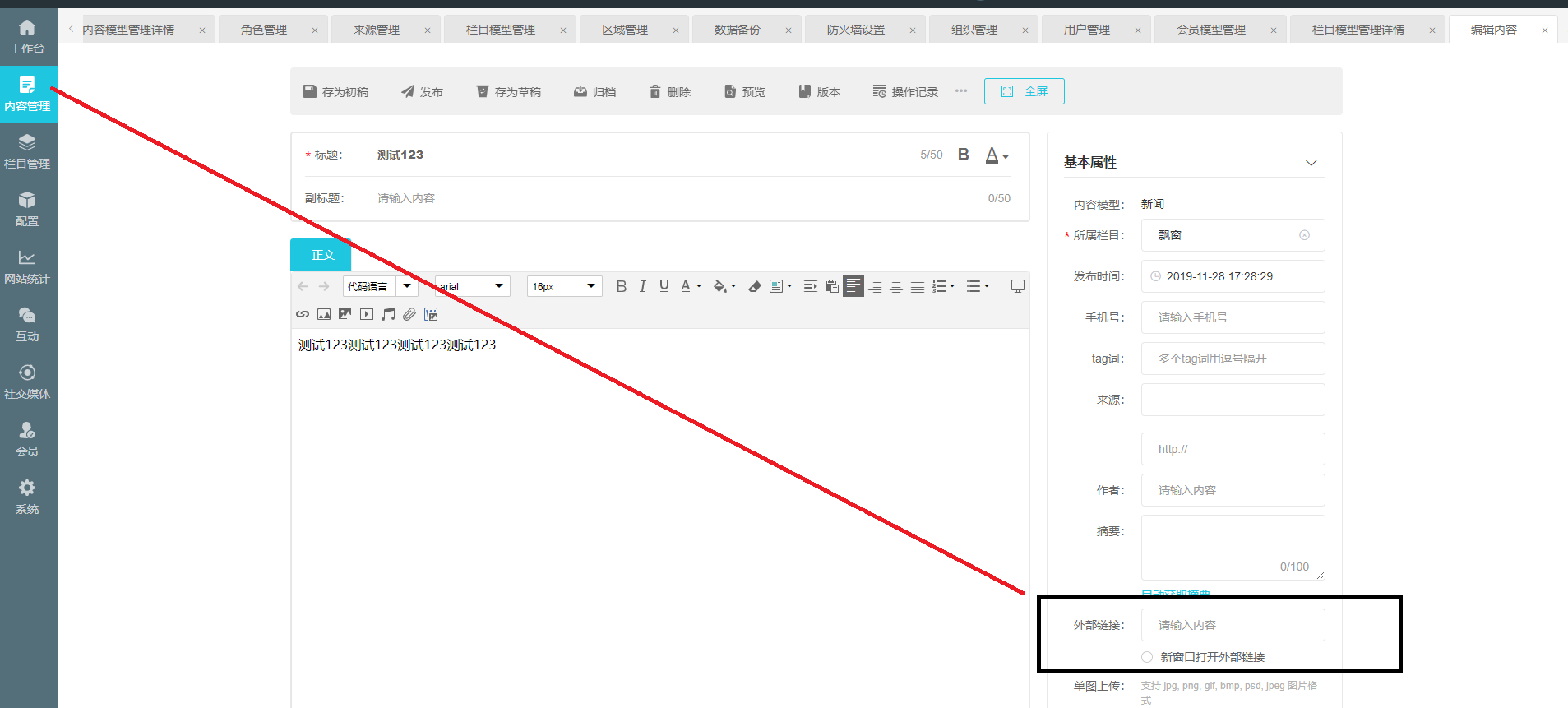 遇到另一个问题,在后台-系统-内容模型-拖拽一个属性,然后到内容管理页面保存数据,也是保存不了。截图如下: 1.在内容页面--新闻--拖一个外部链接到基本属性上: ![]() 2.在刚才形成的外部链接哪里保存一个链接,也无法保存成功,回显是空的,截图如下: ![]() |