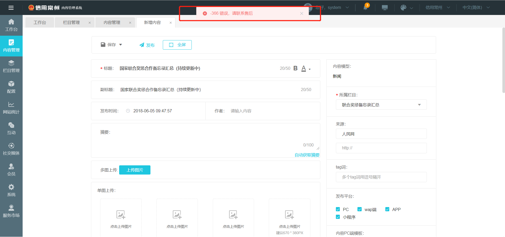 主题 : 编辑内容后保存,报错-366,需联系售后管理员 |
