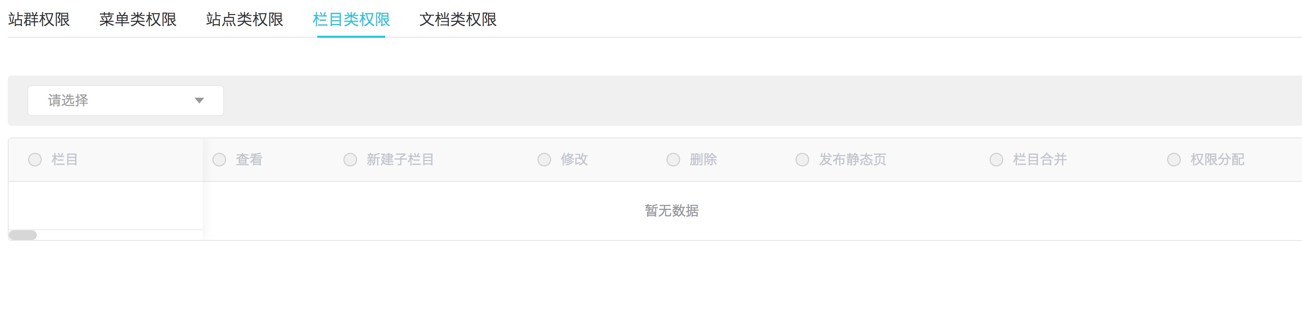 权限配置没什么问题,肯定是个bug,我试过给这个用户两个站点的权限,这样登录以后,右上角就可以切换站点了。只要做了一次切换操作,栏目就正常了。