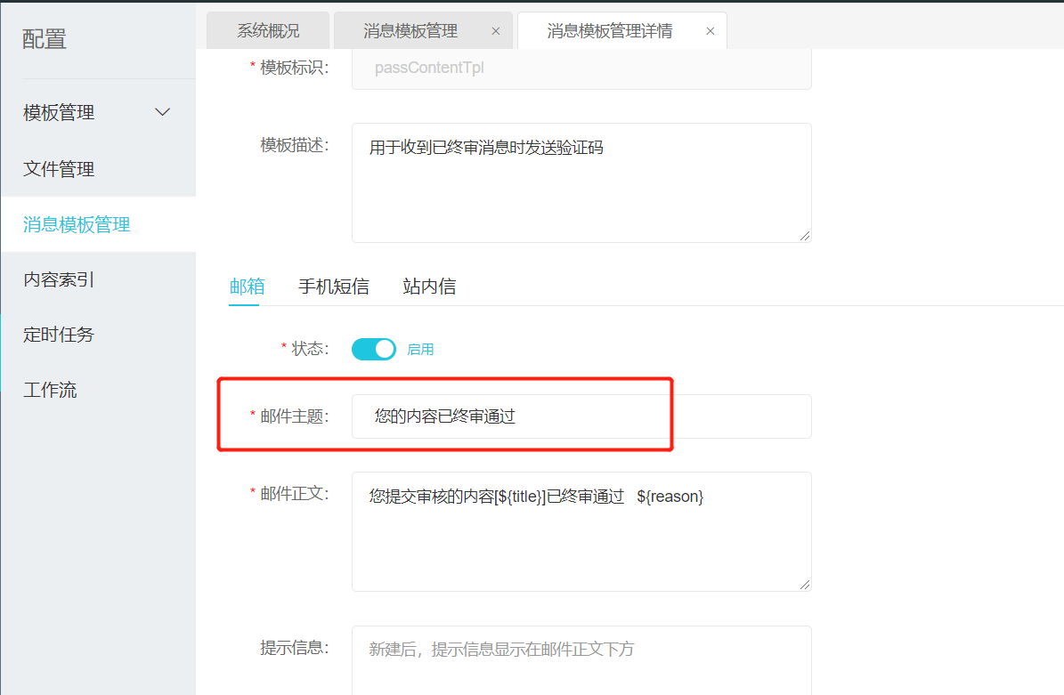 主题 : 邮件服务已经配置好,并可以发送测试邮件,但是 消息模板配置好之后,无法发送邮件
