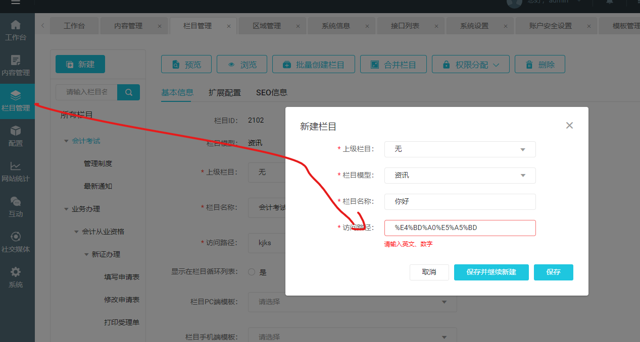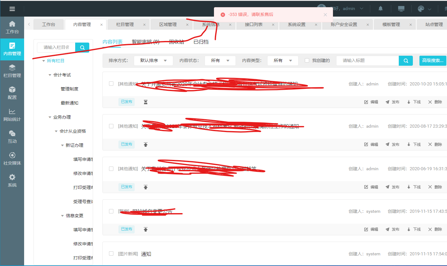原来的版本是1.32,用升级包升级到1.4后,目前发现两个问题,如下:看如何解决 第一个问题,升级完成后,进入后台点击内容管理:353的提示,请联系售后 ![]() 对应的错误日志提示如下: ![]() ![]() 第二个问题,升级问题完成后,进入后台点击栏目管理,新增栏目,出现乱码 ![]() |