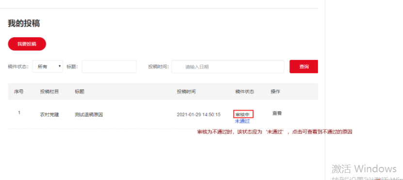 会员投稿后,管理员进行稿件审核,当审核不通过且填写不通过的原因后,信息员的稿件状态还是处于‘审核中’,应该是‘未通过’的状态;