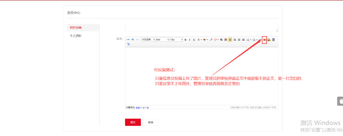 第二张图就是不正常的,在会员我要投稿,富文本里上传图片和输入文字,后台界面富文本就会为空