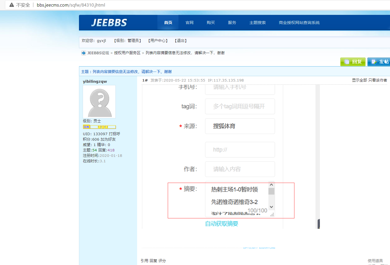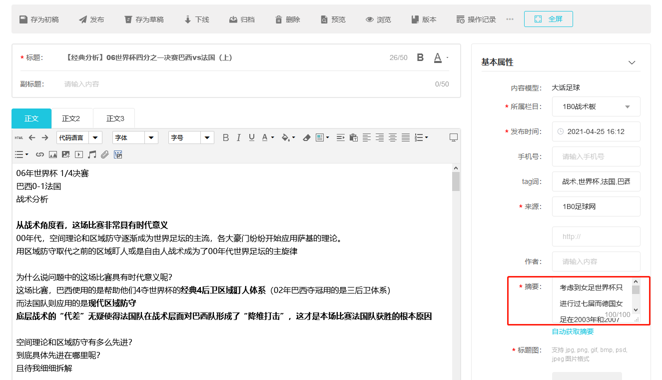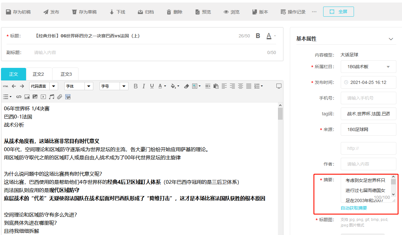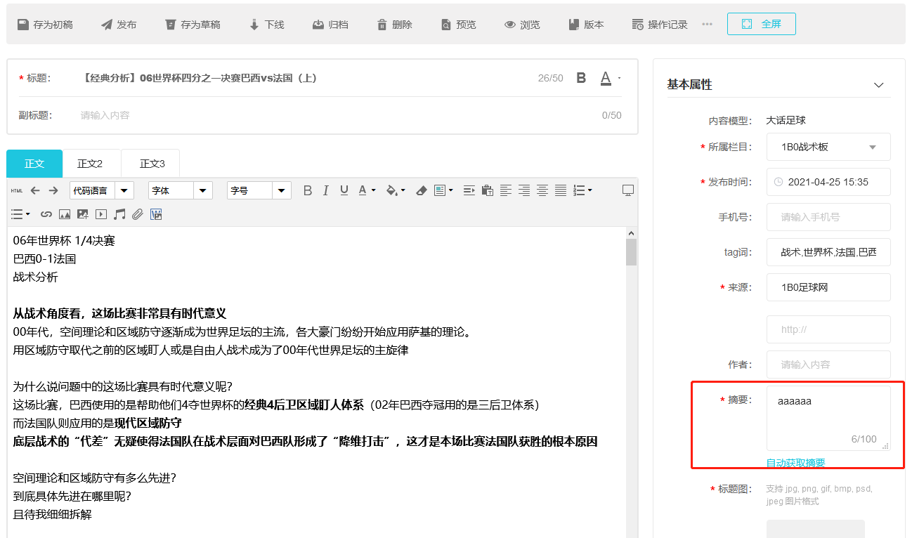x1.1.0 我打开已发布的新闻,显示添加新闻时获取的摘要 ![]() 在发布后,再次进行编辑时,不生效,还是显示原始摘要 ![]() ![]() |