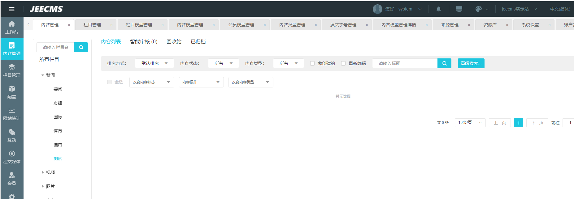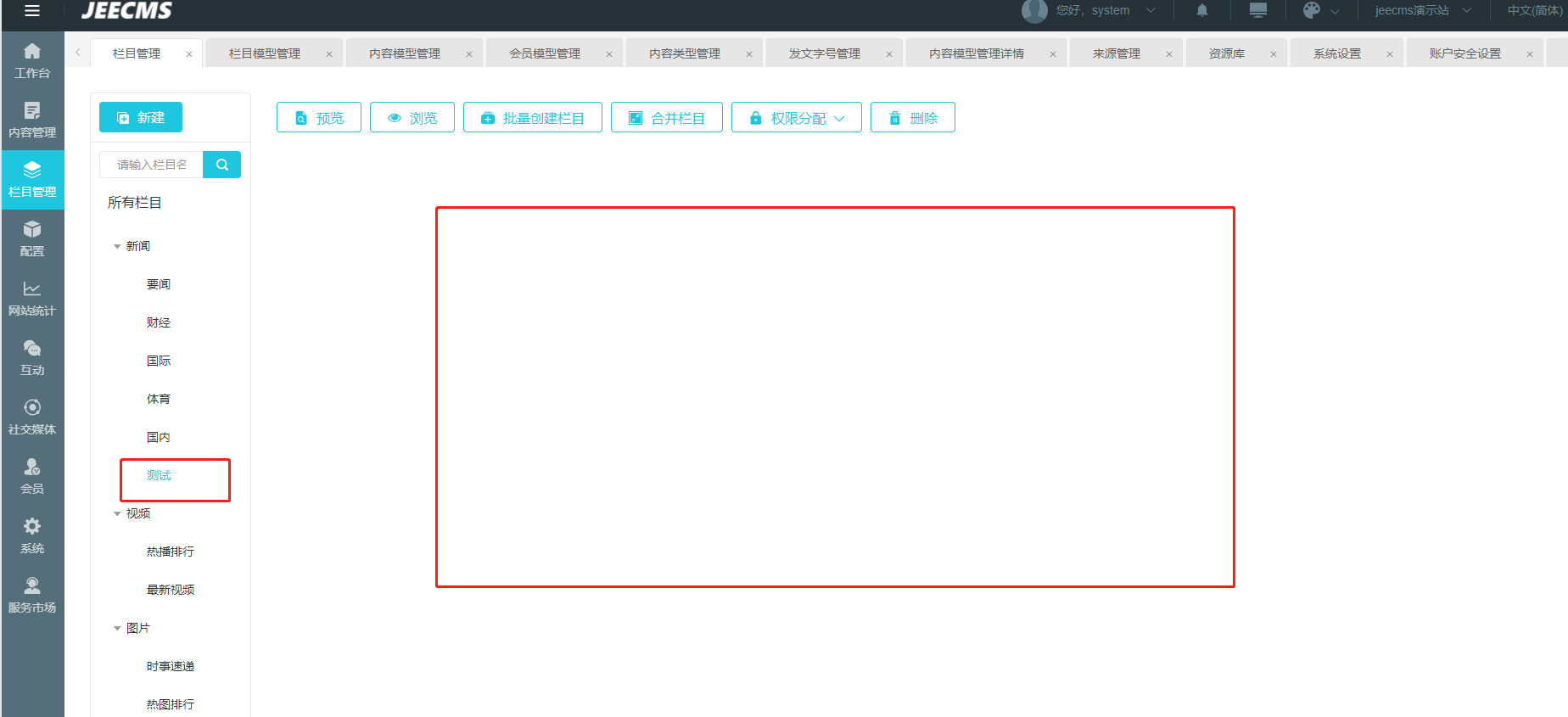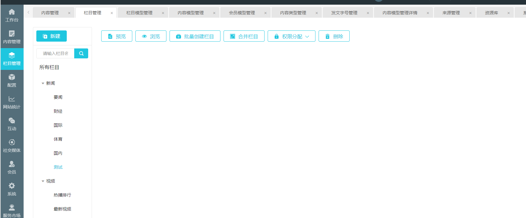 版本: 1.9.0 点击新增加的栏目,显示空白,没有显示 点击内容管理,没有发布新闻的按钮