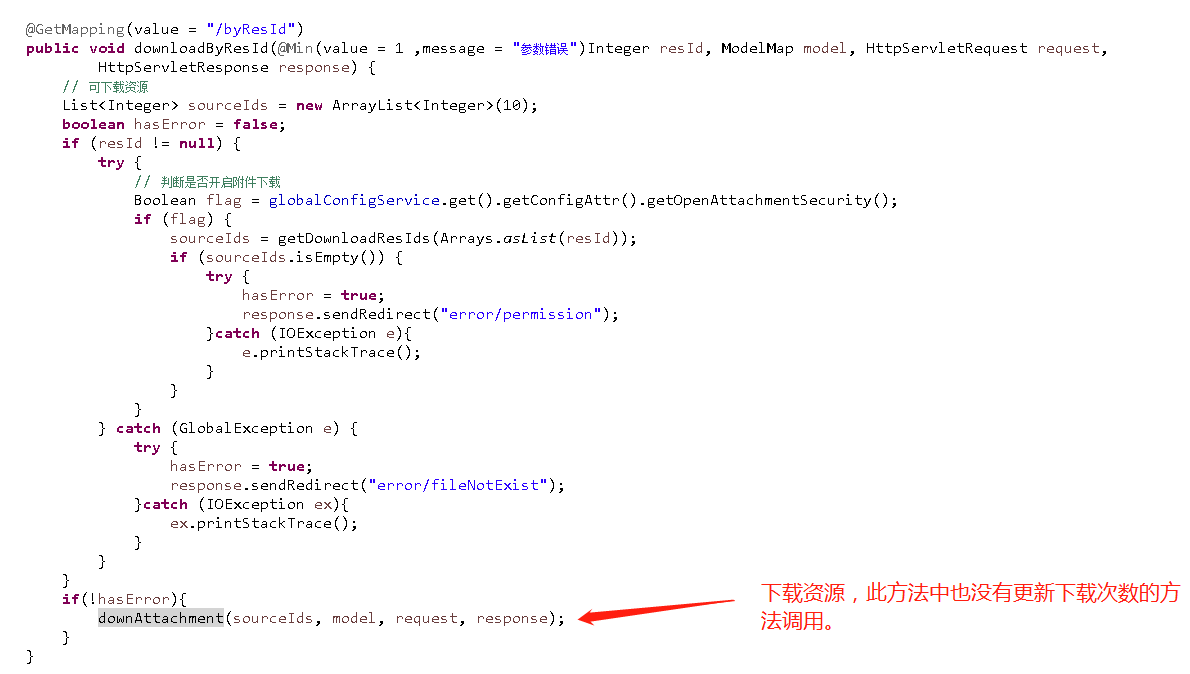 回复第9楼 等了半个多小时了,数据库还是没有数据,调用的接口是:/download/byResId?resId=, 另外我看了下后台的代码,没找到更新下载次数 相关的代码啊。
