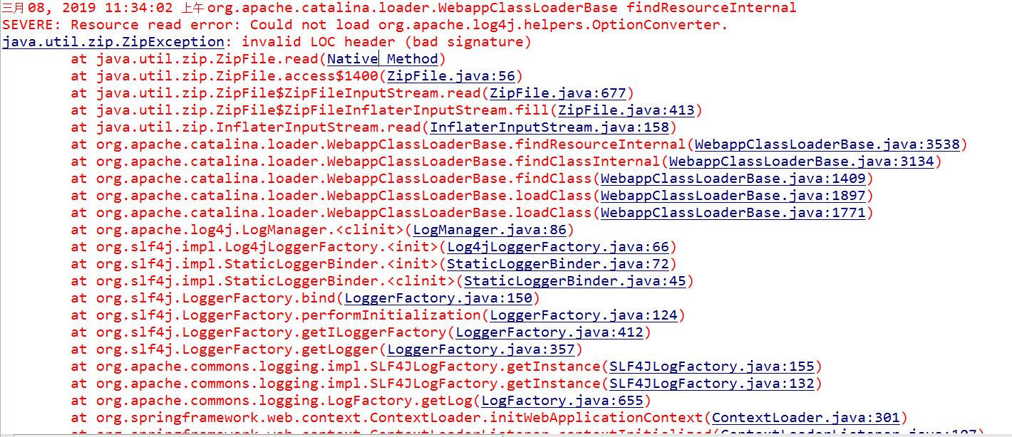 三月 08, 2019 1:53:29 下午 org.apache.catalina.loader.WebappClassLoaderBase findResourceInternal SEVERE: Resource read error: Could not load org.apache.log4j.helpers.OptionConverter. java.util.zip.ZipException: invalid LOC header (bad signature) at java.util.zip.ZipFile.read(Native Method) at java.util.zip.ZipFile.access$1400(ZipFile.java:56) at java.util.zip.ZipFile$ZipFileInputStream.read(ZipFile.java:677) at java.util.zip.ZipFile$ZipFileInflaterInputStream.fill(ZipFile.java:413) at java.util.zip.InflaterInputStream.read(InflaterInputStream.java:158) at org.apache.catalina.loader.WebappClassLoaderBase.findResourceInternal(WebappClassLoaderBase.java:3538) at org.apache.catalina.loader.WebappClassLoaderBase.findClassInternal(WebappClassLoaderBase.java:3134) at org.apache.catalina.loader.WebappClassLoaderBase.findClass(WebappClassLoaderBase.java:1409) at org.apache.catalina.loader.WebappClassLoaderBase.loadClass(WebappClassLoaderBase.java:1897) at org.apache.catalina.loader.WebappClassLoaderBase.loadClass(WebappClassLoaderBase.java:1771) at org.apache.log4j.LogManager.<clinit>(LogManager.java:86) at org.slf4j.impl.Log4jLoggerFactory.<init>(Log4jLoggerFactory.java:66) at org.slf4j.impl.StaticLoggerBinder.<init>(StaticLoggerBinder.java:72) at org.slf4j.impl.StaticLoggerBinder.<clinit>(StaticLoggerBinder.java:45) at org.slf4j.LoggerFactory.bind(LoggerFactory.java:150) at org.slf4j.LoggerFactory.performInitialization(LoggerFactory.java:124) at org.slf4j.LoggerFactory.getILoggerFactory(LoggerFactory.java:412) at org.slf4j.LoggerFactory.getLogger(LoggerFactory.java:357) at org.apache.commons.logging.impl.SLF4JLogFactory.getInstance(SLF4JLogFactory.java:155) at org.apache.commons.logging.impl.SLF4JLogFactory.getInstance(SLF4JLogFactory.java:132) at org.apache.commons.logging.LogFactory.getLog(LogFactory.java:655) at org.springframework.util.PropertyPlaceholderHelper.<clinit>(PropertyPlaceholderHelper.java:40) at org.springframework.web.util.ServletContextPropertyUtils.<clinit>(ServletContextPropertyUtils.java:38) at org.springframework.web.util.Log4jWebConfigurer.initLogging(Log4jWebConfigurer.java:128) at org.springframework.web.util.Log4jConfigListener.contextInitialized(Log4jConfigListener.java:49) at org.apache.catalina.core.StandardContext.listenerStart(StandardContext.java:5157) at org.apache.catalina.core.StandardContext.startInternal(StandardContext.java:5680) at org.apache.catalina.util.LifecycleBase.start(LifecycleBase.java:145) at org.apache.catalina.core.ContainerBase.addChildInternal(ContainerBase.java:1018) at org.apache.catalina.core.ContainerBase.addChild(ContainerBase.java:994) at org.apache.catalina.core.StandardHost.addChild(StandardHost.java:652) at org.apache.catalina.startup.HostConfig.deployDirectory(HostConfig.java:1296) at org.apache.catalina.startup.HostConfig$DeployDirectory.run(HostConfig.java:2039) at java.util.concurrent.Executors$RunnableAdapter.call(Executors.java:471) at java.util.concurrent.FutureTask$Sync.innerRun(FutureTask.java:334) at java.util.concurrent.FutureTask.run(FutureTask.java:166) at java.util.concurrent.ThreadPoolExecutor.runWorker(ThreadPoolExecutor.java:1110) at java.util.concurrent.ThreadPoolExecutor$Worker.run(ThreadPoolExecutor.java:603) at java.lang.Thread.run(Thread.java:722) Failed to instantiate SLF4J LoggerFactory Reported exception: java.lang.NoClassDefFoundError: org/apache/log4j/helpers/OptionConverter at org.apache.log4j.LogManager.<clinit>(LogManager.java:86) at org.slf4j.impl.Log4jLoggerFactory.<init>(Log4jLoggerFactory.java:66) at org.slf4j.impl.StaticLoggerBinder.<init>(StaticLoggerBinder.java:72) at org.slf4j.impl.StaticLoggerBinder.<clinit>(StaticLoggerBinder.java:45) at org.slf4j.LoggerFactory.bind(LoggerFactory.java:150) at org.slf4j.LoggerFactory.performInitialization(LoggerFactory.java:124) at org.slf4j.LoggerFactory.getILoggerFactory(LoggerFactory.java:412) at org.slf4j.LoggerFactory.getLogger(LoggerFactory.java:357) at org.apache.commons.logging.impl.SLF4JLogFactory.getInstance(SLF4JLogFactory.java:155) at org.apache.commons.logging.impl.SLF4JLogFactory.getInstance(SLF4JLogFactory.java:132) at org.apache.commons.logging.LogFactory.getLog(LogFactory.java:655) at org.springframework.util.PropertyPlaceholderHelper.<clinit>(PropertyPlaceholderHelper.java:40) at org.springframework.web.util.ServletContextPropertyUtils.<clinit>(ServletContextPropertyUtils.java:38) at org.springframework.web.util.Log4jWebConfigurer.initLogging(Log4jWebConfigurer.java:128) at org.springframework.web.util.Log4jConfigListener.contextInitialized(Log4jConfigListener.java:49) at org.apache.catalina.core.StandardContext.listenerStart(StandardContext.java:5157) at org.apache.catalina.core.StandardContext.startInternal(StandardContext.java:5680) at org.apache.catalina.util.LifecycleBase.start(LifecycleBase.java:145) at org.apache.catalina.core.ContainerBase.addChildInternal(ContainerBase.java:1018) at org.apache.catalina.core.ContainerBase.addChild(ContainerBase.java:994) at org.apache.catalina.core.StandardHost.addChild(StandardHost.java:652) at org.apache.catalina.startup.HostConfig.deployDirectory(HostConfig.java:1296) at org.apache.catalina.startup.HostConfig$DeployDirectory.run(HostConfig.java:2039) at java.util.concurrent.Executors$RunnableAdapter.call(Executors.java:471) at java.util.concurrent.FutureTask$Sync.innerRun(FutureTask.java:334) at java.util.concurrent.FutureTask.run(FutureTask.java:166) at java.util.concurrent.ThreadPoolExecutor.runWorker(ThreadPoolExecutor.java:1110) at java.util.concurrent.ThreadPoolExecutor$Worker.run(ThreadPoolExecutor.java:603) at java.lang.Thread.run(Thread.java:722) Caused by: java.lang.ClassNotFoundException: org.apache.log4j.helpers.OptionConverter at org.apache.catalina.loader.WebappClassLoaderBase.loadClass(WebappClassLoaderBase.java:1928) at org.apache.catalina.loader.WebappClassLoaderBase.loadClass(WebappClassLoaderBase.java:1771) ... 29 more 三月 08, 2019 1:53:29 下午 org.apache.catalina.core.Stan