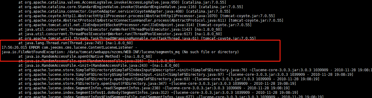 java.io.FileNotFoundException: /data/tomcat/webapps/nzcms/WEB-INF/lucene/segments_mq (No such file or directory) at java.io.RandomAccessFile.open0(Native Method) ~[na:1.8.0_60] at java.io.RandomAccessFile.open(RandomAccessFile.java:316) ~[na:1.8.0_60] at java.io.RandomAccessFile.<init>(RandomAccessFile.java:243) ~[na:1.8.0_60] at org.apache.lucene.store.SimpleFSDirectory$SimpleFSIndexInput$Descriptor.<init>(SimpleFSDirectory.java:76) ~[lucene-core-3.0.3.jar:3.0.3 1039909 - 2010-11-28 19:08:19] at org.apache.lucene.store.SimpleFSDirectory$SimpleFSIndexInput.<init>(SimpleFSDirectory.java:97) ~[lucene-core-3.0.3.jar:3.0.3 1039909 - 2010-11-28 19:08:19] at org.apache.lucene.store.SimpleFSDirectory.openInput(SimpleFSDirectory.java:63) ~[lucene-core-3.0.3.jar:3.0.3 1039909 - 2010-11-28 19:08:19] at org.apache.lucene.store.FSDirectory.openInput(FSDirectory.java:347) ~[lucene-core-3.0.3.jar:3.0.3 1039909 - 2010-11-28 19:08:19] at org.apache.lucene.index.SegmentInfos.read(SegmentInfos.java:238) ~[lucene-core-3.0.3.jar:3.0.3 1039909 - 2010-11-28 19:08:19] at org.apache.lucene.index.SegmentInfos$1.doBody(SegmentInfos.java:312) ~[lucene-core-3.0.3.jar:3.0.3 1039909 - 2010-11-28 19:08:19] at org.apache.lucene.index.SegmentInfos$FindSegmentsFile.run(SegmentInfos.java:677) ~[lucene-core-3.0.3.jar:3.0.3 1039909 - 2010-11-28 19:08:19] at org.apache.lucene.index.SegmentInfos$FindSegmentsFile.run(SegmentInfos.java:521) ~[lucene-core-3.0.3.jar:3.0.3 1039909 - 2010-11-28 19:08:19] at org.apache.lucene.index.SegmentInfos.read(SegmentInfos.java:308) ~[lucene-core-3.0.3.jar:3.0.3 1039909 - 2010-11-28 19:08:19] at org.apache.lucene.index.IndexWriter.init(IndexWriter.java:1099) ~[lucene-core-3.0.3.jar:3.0.3 1039909 - 2010-11-28 19:08:19] at org.apache.lucene.index.IndexWriter.<init>(IndexWriter.java:888) ~[lucene-core-3.0.3.jar:3.0.3 1039909 - 2010-11-28 19:08:19] at com.jeecms.cms.lucene.LuceneContentSvcImpl.updateIndex(LuceneContentSvcImpl.java:118) ~[LuceneContentSvcImpl.class:na] at com.jeecms.cms.lucene.LuceneContentSvcImpl.updateIndex(LuceneContentSvcImpl.java:112) ~[LuceneContentSvcImpl.class:na] at sun.reflect.NativeMethodAccessorImpl.invoke0(Native Method) ~[na:1.8.0_60] at sun.reflect.NativeMethodAccessorImpl.invoke(NativeMethodAccessorImpl.java:62) ~[na:1.8.0_60] at sun.reflect.DelegatingMethodAccessorImpl.invoke(DelegatingMethodAccessorImpl.java:43) ~[na:1.8.0_60] at java.lang.reflect.Method.invoke(Method.java:497) ~[na:1.8.0_60] at org.springframework.aop.support.AopUtils.invokeJoinpointUsingReflection(AopUtils.java:317) [spring-aop-3.2.6.jar:3.2.6.RELEASE] at org.springframework.aop.framework.ReflectiveMethodInvocation.invokeJoinpoint(ReflectiveMethodInvocation.java:183) [spring-aop-3.2.6.jar:3.2.6.RELEASE] at org.springframework.aop.framework.ReflectiveMethodInvocation.proceed(ReflectiveMethodInvocation.java:150) [spring-aop-3.2.6.jar:3.2.6.RELEASE] at org.springframework.transaction.interceptor.TransactionInterceptor$1.proceedWithInvocation(TransactionInterceptor.java:96) [spring-tx-3.2.6.jar:3.2.6.RELEASE] at org.springframework.transaction.interceptor.TransactionAspectSupport.invokeWithinTransaction(TransactionAspectSupport.java:260) [spring-tx-3.2.6.jar:3.2.6.RELEASE] at org.springframework.transaction.interceptor.TransactionInterceptor.invoke(TransactionInterceptor.java:94) [spring-tx-3.2.6.jar:3.2.6.RELEASE] at org.springframework.aop.framework.ReflectiveMethodInvocation.proceed(ReflectiveMethodInvocation.java:172) [spring-aop-3.2.6.jar:3.2.6.RELEASE] at org.springframework.aop.framework.JdkDynamicAopProxy.invoke(JdkDynamicAopProxy.java:204) [spring-aop-3.2.6.jar:3.2.6.RELEASE] at com.sun.proxy.$Proxy62.updateIndex(Unknown Source) ~[na:na] at com.jeecms.cms.lucene.ContentLuceneListener.afterChange(ContentLuceneListener.java:53) ~[ContentLuceneListener.class:na] at com.jeecms.cms.manager.main.impl.ContentMngImpl.afterChange(ContentMngImpl.java:878) [ContentMngImpl.class:na] at com.jeecms.cms.manager.main.impl.ContentMngImpl.update(ContentMngImpl.java:478) [ContentMngImpl.class:na] at sun.reflect.NativeMethodAccessorImpl.invoke0(Native Method) ~[na:1.8.0_60] at sun.reflect.NativeMethodAccessorImpl.invoke(NativeMethodAccessorImpl.java:62) ~[na:1.8.0_60] at sun.reflect.DelegatingMethodAccessorImpl.invoke(DelegatingMethodAccessorImpl.java:43) ~[na:1.8.0_60] at java.lang.reflect.Method.invoke(Method.java:497) ~[na:1.8.0_60] at org.springframework.aop.support.AopUtils.invokeJoinpointUsingReflection(AopUtils.java:317) [spring-aop-3.2.6.jar |
